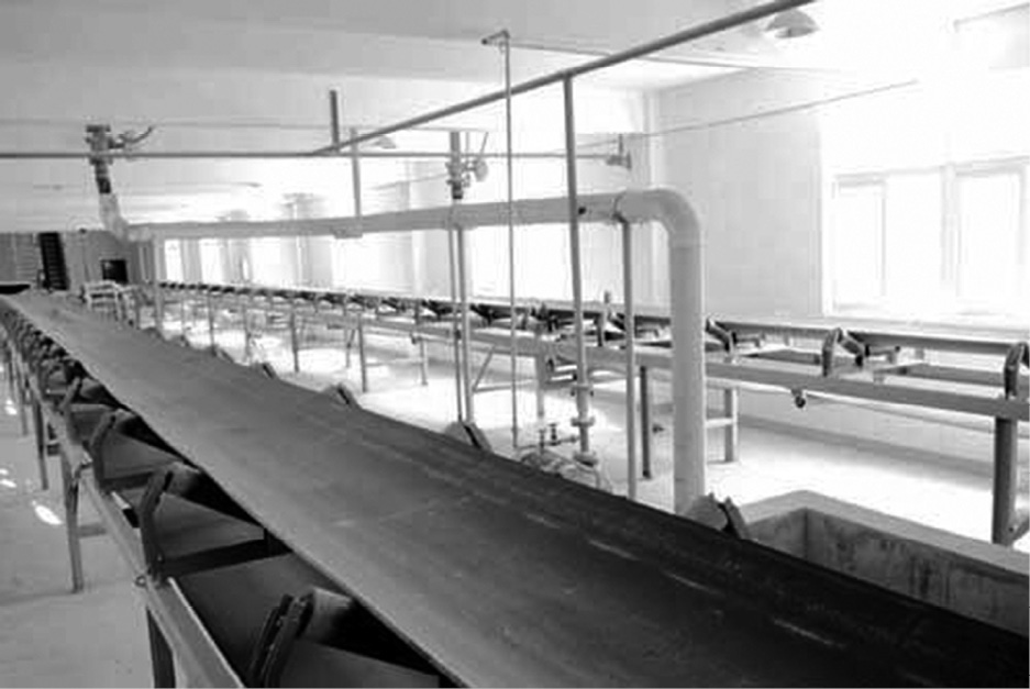 1981年,衡阳运输机械总厂接手长沙黑色金属矿山设计院研制的多托辊双杠杆式皮带秤秤架的制作,在皮带秤制作和销售过程中发现,由于受生产现场条件的限制,当新型秤架结构进行试验、鉴定或面对用户演示时,都需要耗费很多人力物力,有的项目甚至无法进行。为了摸索最佳的秤架结构形式,了解影响皮带秤准确度的各种因素,方便皮带秤的定型鉴定及向用户展示新型秤架的优点,利用运输机械厂制造皮带输送机及相关机械设备的优势和闲置的设备,在很短的时间内就建成了一套皮带秤试验装置。这套皮带秤试验装置由5条物料输送皮带机、2条试验皮带机、储料斗、称量料斗、分料漏斗等组成。1#试验皮带机为带宽1000mm的水平皮带输送机,2#试验皮带机为带宽800mm的可变倾角(0°~18°)、可变带速(0.51m/s、1.1m/s、1.91m/s、3.3m/s)的皮带输送机。