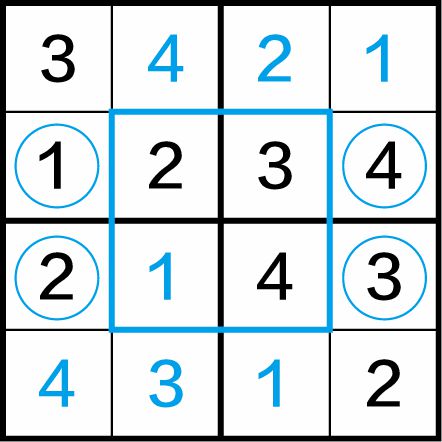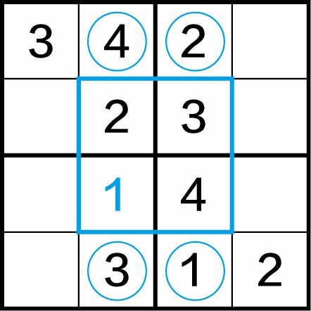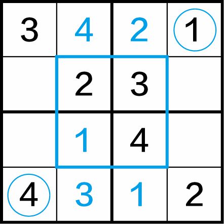 第三步:在第一、第四行中都是“四缺一”,所以(1,4)格中应填入数字1,(4,1)格中应填入数字4,如图2-3(c)所示。