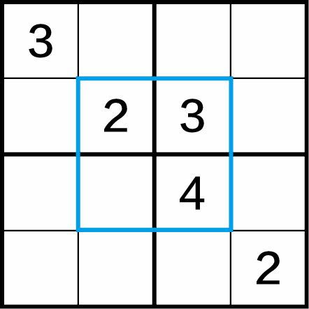现在来看图2-2,它给出了5个已知数3、2、3、4、2,还缺11个数字待填。由此可以看出,在每行、每列及4个顶角上的4个小方格中都不是“四缺一”,只有中心四宫格中的4个小方格中的数字是“四缺一”。因此,解题方法如下。