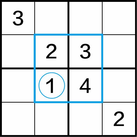 第一步:先从中心四宫格入手,在(3,2)格中填入数字1,如图2-3(a)所示。