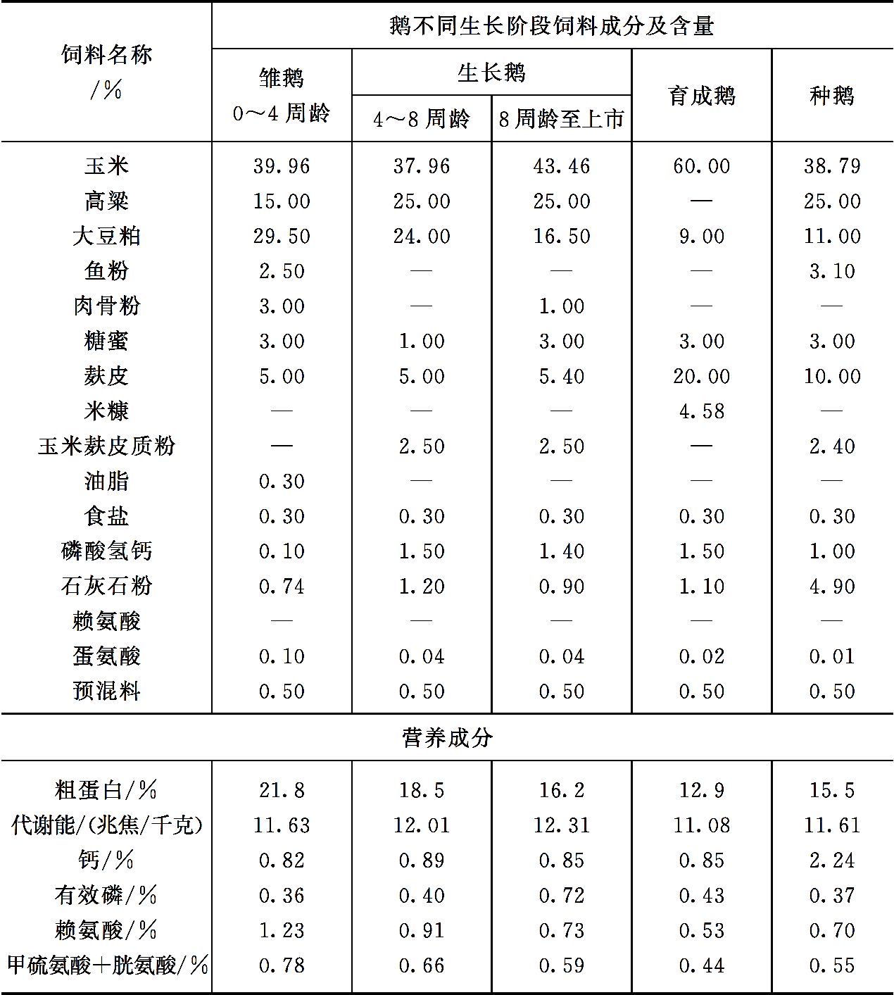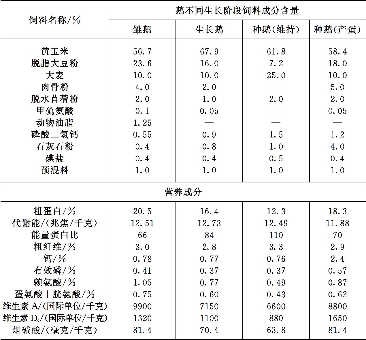 (1)符合鹅的营养需要 日粮配合的依据是鹅的饲养标准和营养价值表,设计饲料配方时,要明确饲养对象,选用适当的饲养标准,并根据生产实践经验作适当调整。