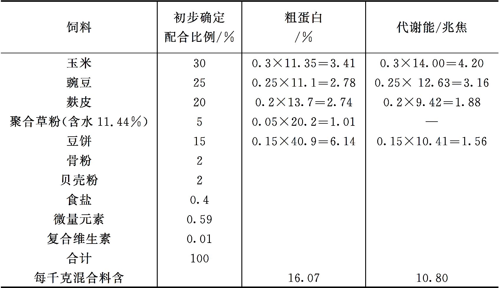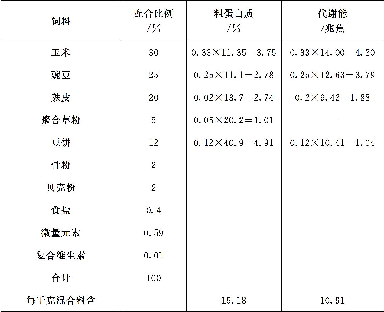 ④调整配方。如初步计算的日粮含粗蛋白为16.07%,比15.0%标准偏高,代谢能基本符合要求。这时要适当减少含蛋白质高的豆饼,相应增加含能量与豆饼相同或略高、含蛋白质低的饲料,如豌豆,见表3-3。经调整,日粮含粗蛋白15.18%,代谢能10.91兆焦/千克,与饲养标准基本相同,可以确定下来。若调整后仍有较大偏差,则需继续调整,直至基本一致为止。