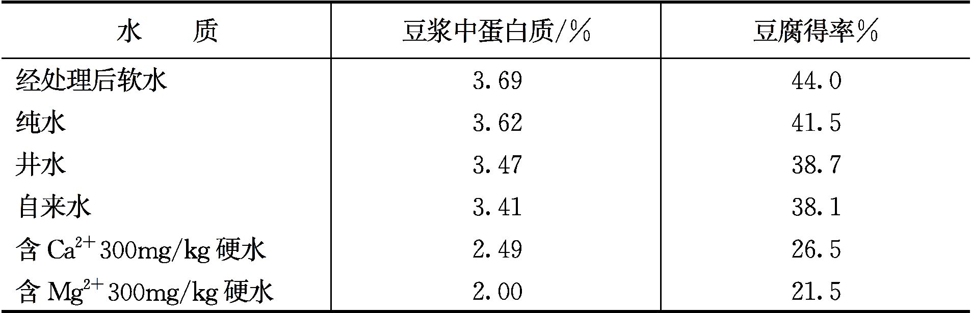 大量的生产实践证明,软水制豆腐要比硬水好得多,表2-4是取蛋白质含量36%、水分11%的大豆原料,用不同水源制成10°Bé的豆浆测豆浆蛋白质含量和制成豆腐出品率(以豆浆计)的结果比较表。