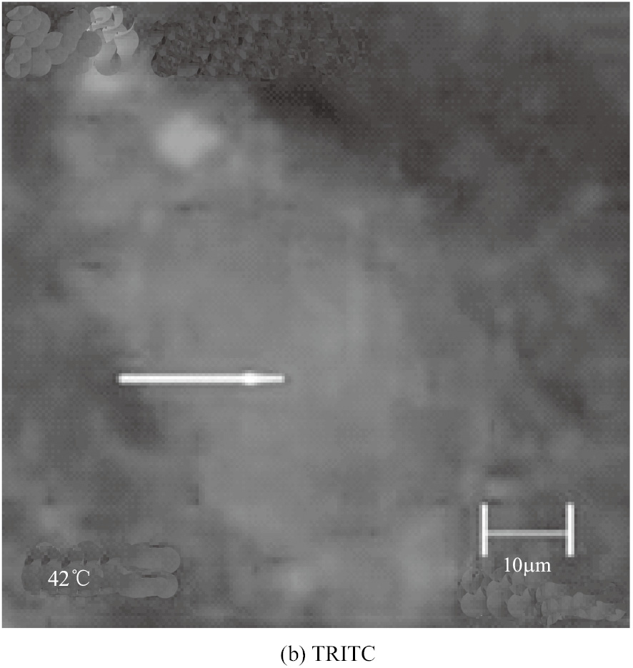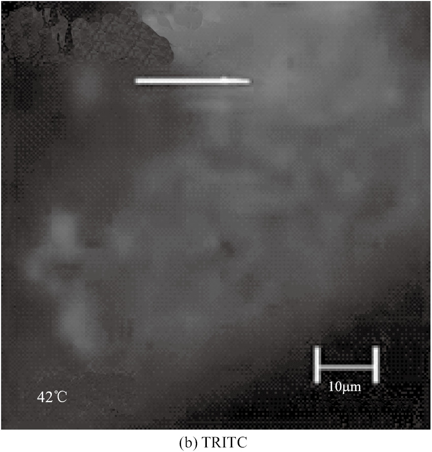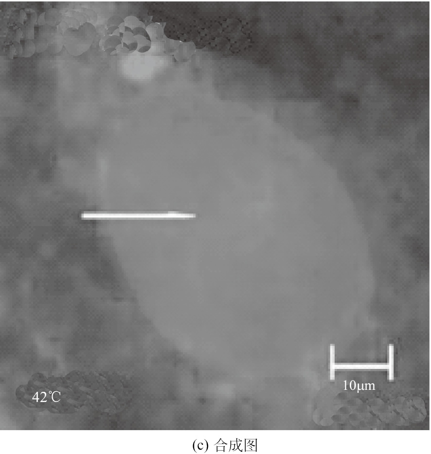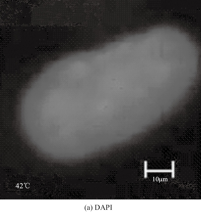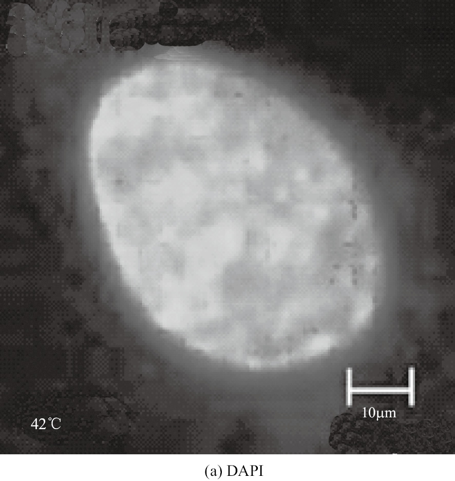 热应激处理心肌细胞内Hsp110的定位结果如下。对照组心肌细胞的细胞质中分布有较多的Hsp110红染阳性颗粒,细胞核中也有少量分布[图4-5(a)、(b)、(c),37℃];60min热应激组心肌细胞的细胞质内Hsp110红色阳性染色颗粒较对照组明显增多,但在细胞核内较少分布,且与对照组心肌细胞相比,无明显差别[图4-6(a)、(b)、(c),42℃];240min热应激组心肌细胞的细胞质内红色染色阳性颗粒极显著增多,而且细胞核内出现大量粉红色着染的Hsp110阳性颗粒[图4-7(a)、(b)、(c),42℃]。