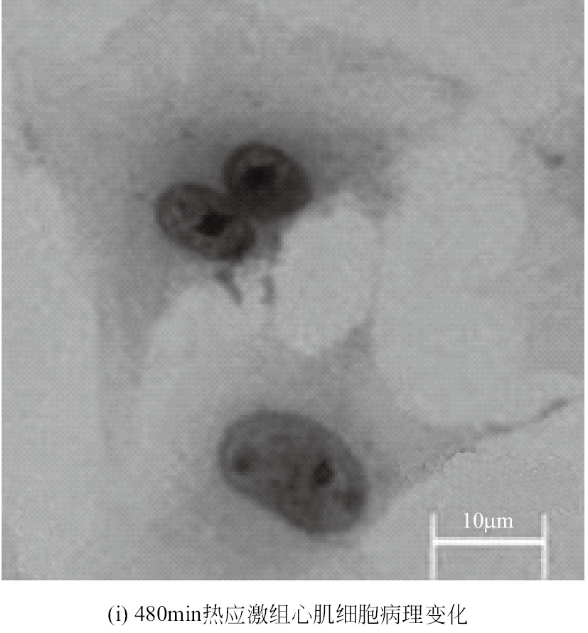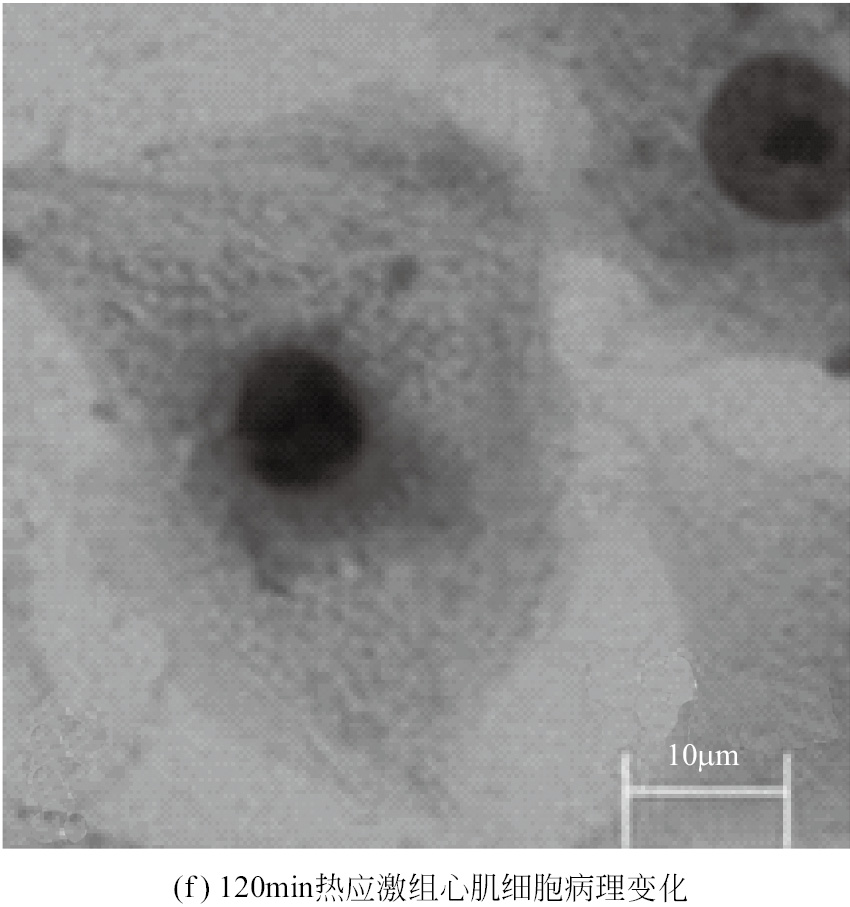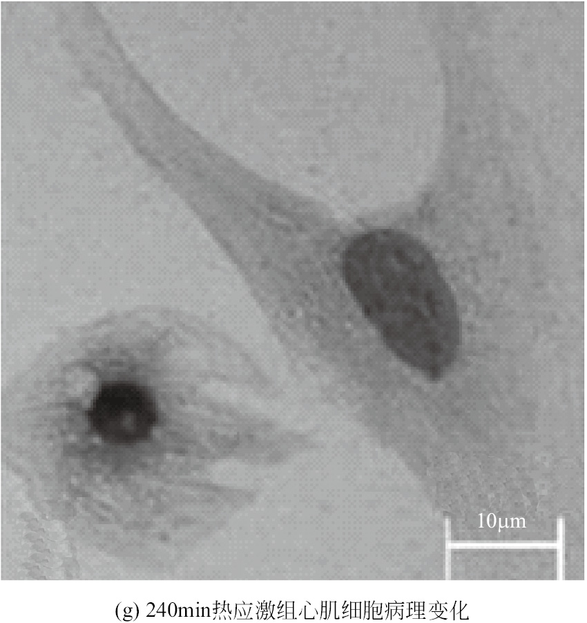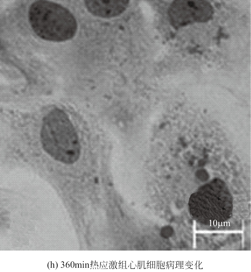 热应激心肌细胞的应激性病理损伤结果见图4-4。在42℃条件下持续进行热应激处理,10min热应激处理组心肌细胞的细胞质内出现少量红染的颗粒,细胞质稍微红染,细胞体积无明显变化[图4-4(b)];20min热应激组心肌细胞的细胞质内出现较多的红染颗粒,心肌细胞体积没有明显变化[图4-4(c)];40min热应激组心肌细胞的细胞质内出现大量密集分布的红染颗粒,细胞体积变大[图4-4(d)];60min热应激组心肌细胞的细胞质内存在大量的红染颗粒,细胞核深染[图4-4(e)];120min热应激组心肌细胞的细胞质内具有多量的红染颗粒,细胞体积显著变大,细胞核深染、体积显著缩小[图4-4(f)];240min热应激组心肌细胞的细胞质内红染颗粒显著减少,细胞核深染、体积缩小[图4-4(g)];360min热应激组心肌细胞的细胞质内红染颗粒减少,细胞染色逐渐变淡、体积无明显变化[图4-4(h)];480min热应激组心肌细胞的细胞质内红染颗粒消失,细胞质均质红染,体积无明显变化,细胞核体积、染色无明显改变[图4-4(i)]。