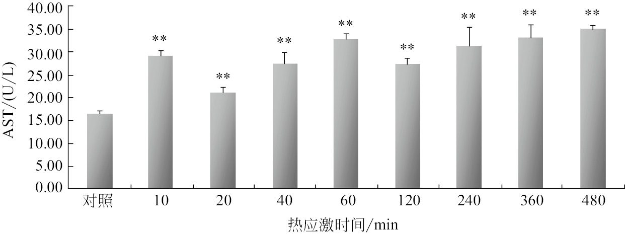 在42℃条件下持续进行480min的热应激处理,试验组心肌细胞培养液中AST的含量值均高于对照组(图4-3),而且从热应激处理10min后所检测到的AST值与对照组相比,差异极显著( P <0.01)。