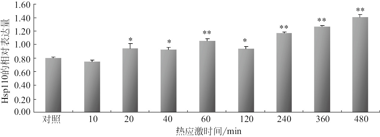 在42℃条件下,经过480min的持续性热应激,心肌细胞内Hsp110的表达水平呈现逐渐升高的趋势(图4-9)。与对照相比,10min热应激组心肌细胞内Hsp110的相对表达量呈现暂时性下降,但与对照组相比差异不显著( P >0.05);20min热应激后,热应激组心肌细胞内Hsp110的相对表达量显著上升,但在热应激20~120min热应激期间,心肌细胞内Hsp110的相对表达量上升幅度有限( P <0.05);而在热应激处理240~480min期间,心肌细胞内Hsp110的相对表达量显著上升,与对照组心肌细胞相比,不仅差异极显著( P <0.01),而且其相对表达量的值均大于1.1。