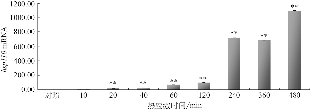 在42℃条件下经过480min的持续性热应激,心肌细胞内 hsp110 mRNA的转录水平均高于对照组(图4-8)。10min热应激组心肌细胞内 hsp110 mRNA的转录量升高,但与对照组相比差异不明显( P >0.05);20~120min热应激组心肌细胞内 hsp110 mRNA的转录量显著高于对照组( P <0.01);240~480min热应激组心肌细胞内 hsp110 mRNA的转录量均极显著高于对照组心肌细胞( P <0.01),而且其转录量均数倍于20~120min热应激组心肌细胞内 hsp110 mRNA的转录量。