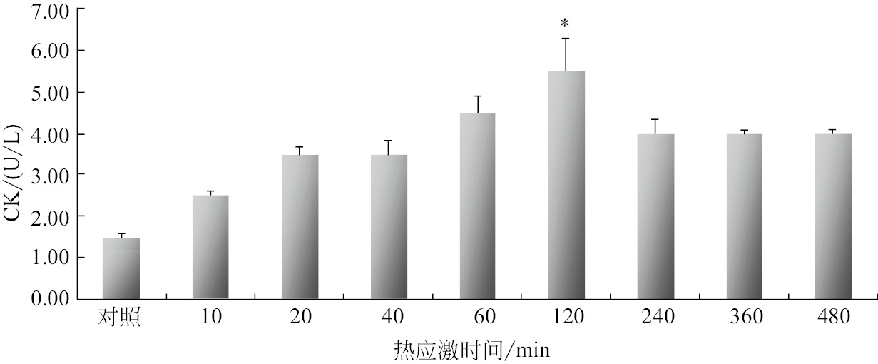在42℃条件下持续进行480min的热应激处理,试验组心肌细胞培养液中CK的含量值均高于对照组,其中在热应激处理120min所检测到的CK值显著大于对照组( P <0.05),但热应激处理120min后,检测到的CK值呈现出下降趋势(图4-2)。