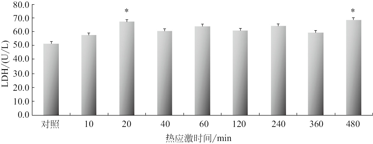 在42℃条件下持续进行480min的热应激处理,试验组心肌细胞培养液中LDH的含量值均高于对照组(图4-1),其中在热应激处理20min、480min所检测到的LDH值显著大于对照组( P <0.05)。