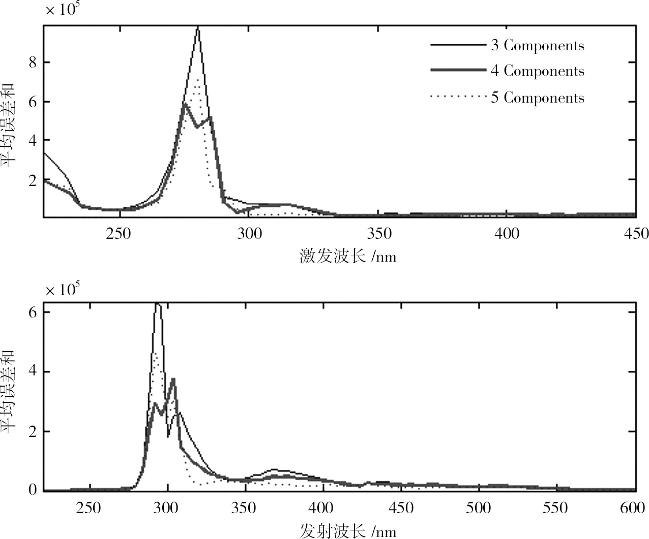 激发波长和发散波长的残差分析(平均误差和)用于确定PARAFAC分析的最佳组分数,如图2-14所示。从图中可以看出,4个组分下的激发波长和发散波长的残差均小于3个组分和5个组分的残差,因此适用于此荧光光谱的PARAFAC分析最佳组分数为4。