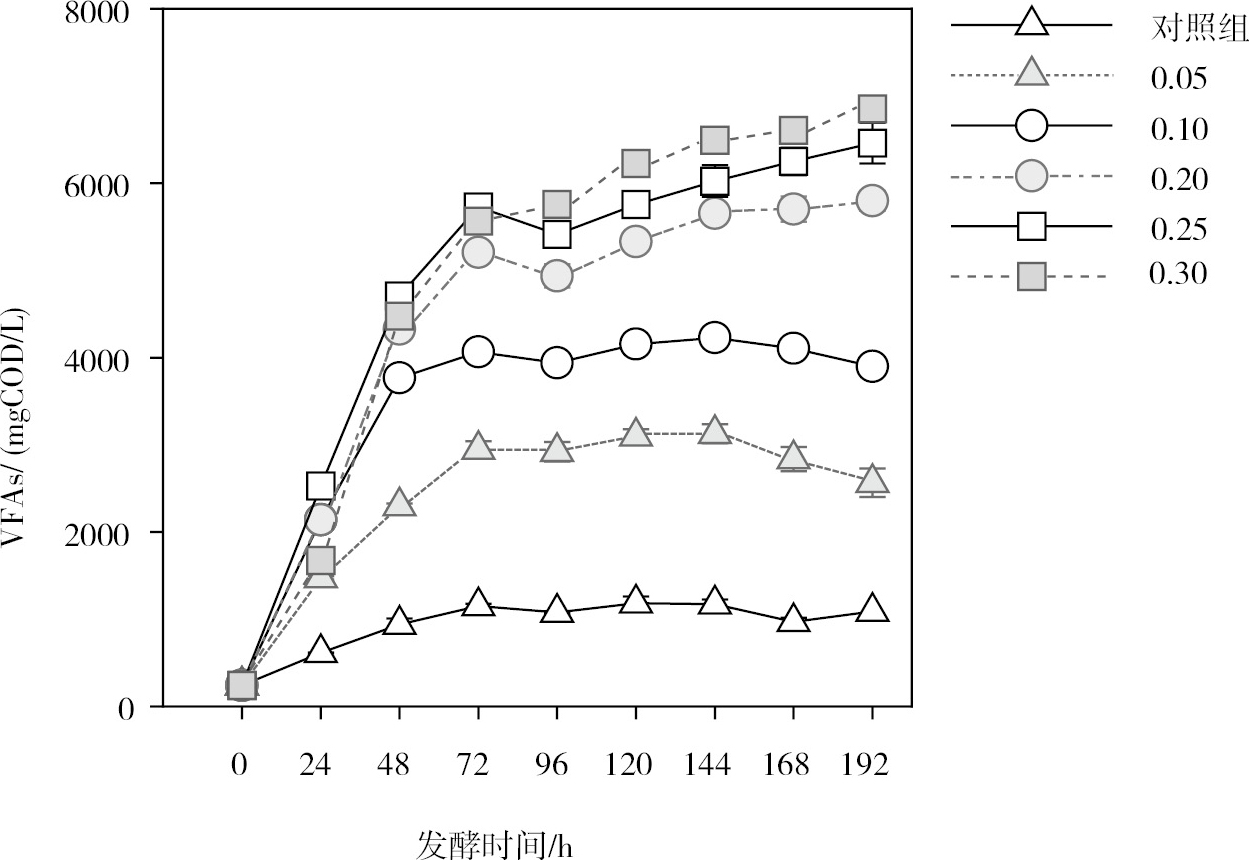 皂苷作为一种表面活性剂在工业中应用范围很广 [116] 。研究成功证实皂苷预处理对于提高污泥厌氧消化性能的可行性。近年来,很多研究者开展从污泥中回收碳源的研究,发现酸化发酵污泥可以作为底物用于生物营养物去除 [117] 、生物聚合物合成 [118] 、微生物电解产氢 [29] 等。表2-6为各种表面活性剂预处理剩余污泥的挥发酸产量的对比。