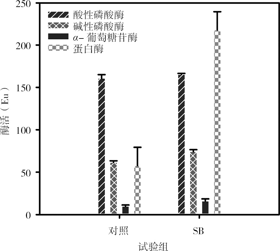 皂苷预处理对剩余污泥发酵系统中蛋白质的降解也有明显的促进作用,这也可以间接通过氨氮(蛋白质降解的产物)含量的增加来证实。从图2-12(a)可以看出,氨氮释放量随着皂苷投加量的增加而逐渐增加。以0.20gSB/gTSS试验组为例,释放的氨氮浓度达到29.2mg/L,相比较空白组增加了91.10%。这个趋势也跟蛋白质溶出的趋势相一致。目前发酵系统里测到的蛋白质浓度为溶出和降解后的平衡数值,溶解性蛋白质浓度的增加也说明皂苷预处理导致的实际蛋白溶出量更多。皂苷预处理同样促进了溶解性总磷的释放:酸性磷酸酶和碱性磷酸酶的酶活在皂苷存在的情况下有明显的提升[图2-12(b)],这两种酶能够水解磷酸磷脂并释放磷酸集团到液相中。Cadoret等证实污泥絮体中相当部分水解酶关联于松散型胞外聚合物中 [106] 。水解酶活性增加的原因可能是由于皂苷的投入使得胞外聚合物和其他微生物聚合物剥离细胞表面,同时,释放其中固定的水解酶到液相中。该结果也可以用后来的荧光光谱分析来证实。