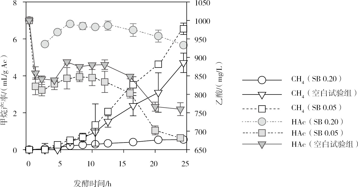 图2-19(c)显示了皂苷投加量为0.20g/gBu时,丁酸转化成乙酸和后续产甲烷的影响。丁酸的浓度在最开始的发酵10h内迅速的降低,后随着发酵时间的进一步延长,浓度并没有持续降低。作为丙酸通过 ß -氧化途径降解的产物,乙酸的浓度相应的增加然后降解为甲烷。具体的丁酸降解热力学方程见3.2.2部分。显然,皂苷预处理增加了丁酸的降解速率,因为其在发酵2h时很快的转化成乙酸,然而未经皂苷处理的试验组需要8h。乙酸转化成甲烷的结果也证明了这点。经过16h的厌氧发酵,皂苷处理和对照试验组的甲烷产率分别为(2.7±0.1)mL/gBu和(1.5±0.1)mL/gBu。