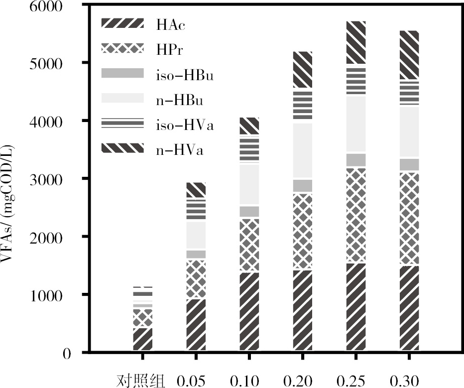 图2-18为皂素投加量对剩余污泥发酵过程中挥发酸产量及组分的影响。从图中可以看出,皂苷的投加使剩余污泥的酸化性能明显提高。随着厌氧发酵时间的进行,挥发酸产量先明显升高后逐渐平缓。发酵72h时,各组挥发酸产量达到最大,皂素投加量为0.05g/gTSS、0.10g/gTSS、0.20g/gTSS、0.25g/gTSS和0.30g/gTSS时,挥发酸产量分别为未经处理试验组[(1153±28)mgCOD/L]的1.56倍、2.53倍、3.51倍、3.97倍和3.83倍。从图2-22(a)中可以看出,挥发酸含量随着皂素投加量的增加而明显增加,但投加量>0.20g/gTSS时,增加趋势不明显。进一步研究发现,挥发酸产量与发酵时间呈二次函数关系,以发酵时间72h为例,在皂苷投加量范围0.05~0.30gSB/gTSS内,YVFAs=-65241×2SBdosage+33819×SBdosage+1267, R 2 =0.997。皂苷投加量在0~0.05g/gTSS、0.05~0.10g/gTSS、0.10~0.20g/gTSS、0.20~0.25g/gTSS和0.25~0.3g/gTSS区间内,挥发酸增加量分别为1416gCOD/L、884gCOD/L、450gCOD/L、414gCOD/L和0。明显,0~0.05gSB/gTSS区间内挥发酸增加量最高。