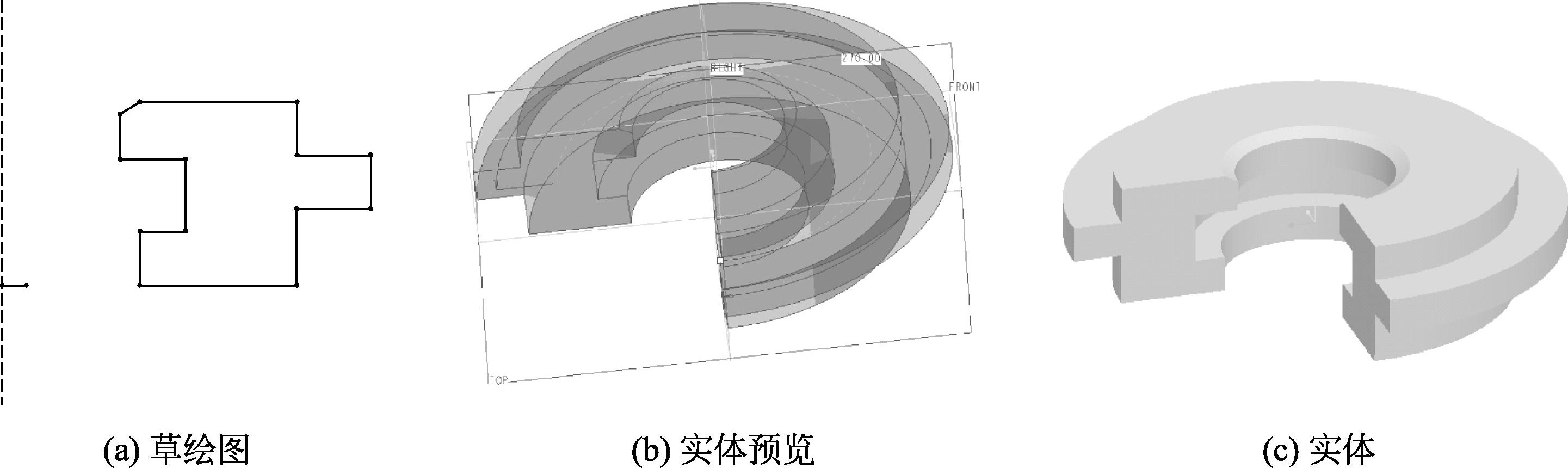 要创建旋转特征,首先要激活旋转工具,并指定特征类型为实体;然后创建包含旋转轴和草绘截面;创建有效截面后,旋转工具将构建缺省旋转特征,并显示几何预览;最后,可改变旋转角度,在实体或曲面、伸出项或切口间进行切换,或指定草绘厚度以创建薄壁特征。如图2-22所示。