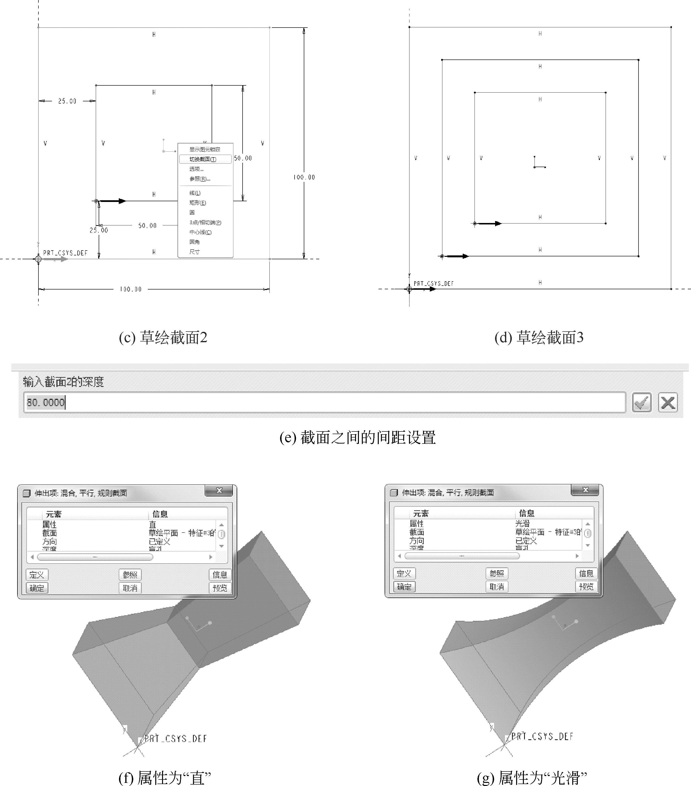 混合特征是指使用过渡曲线把不同的截面按照定义的约束连接成一个整体。混合特征建模不需要绘制轨迹曲线,它是一系列不同的截面,至少需要两个截面,按照定义的平行、旋转或者平移等约束连接成一个实体,这里的截面图元的大小、形状及方向都可能发生变化,如图2-25所示。所有混合类型都包括以下四个基本要素。