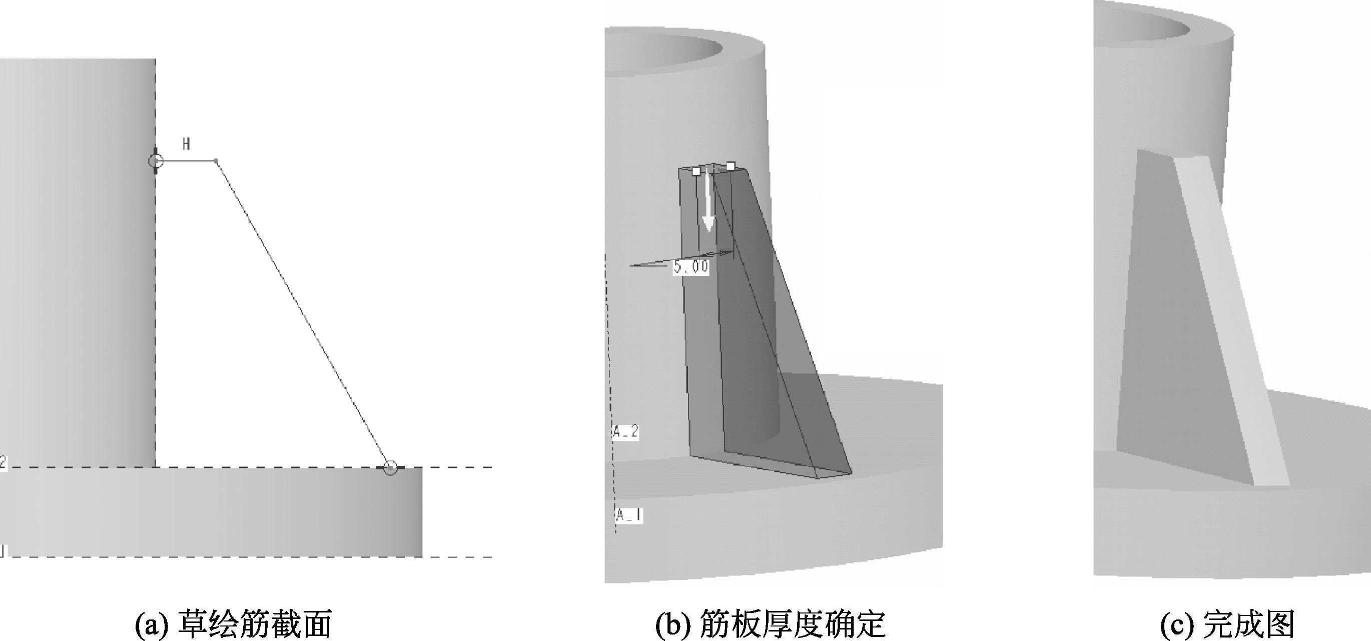 为了快速创建零件上经常出现的加强筋,Pro/Engineer中提供了筋特征造型工具,筋特征与拉伸特征类似,但不同的是,筋特征的横截面会自动变化,并与相连的曲面边界保持封闭,这一点使得在创建与曲面相连的筋时显得非常方便,见图2-32。