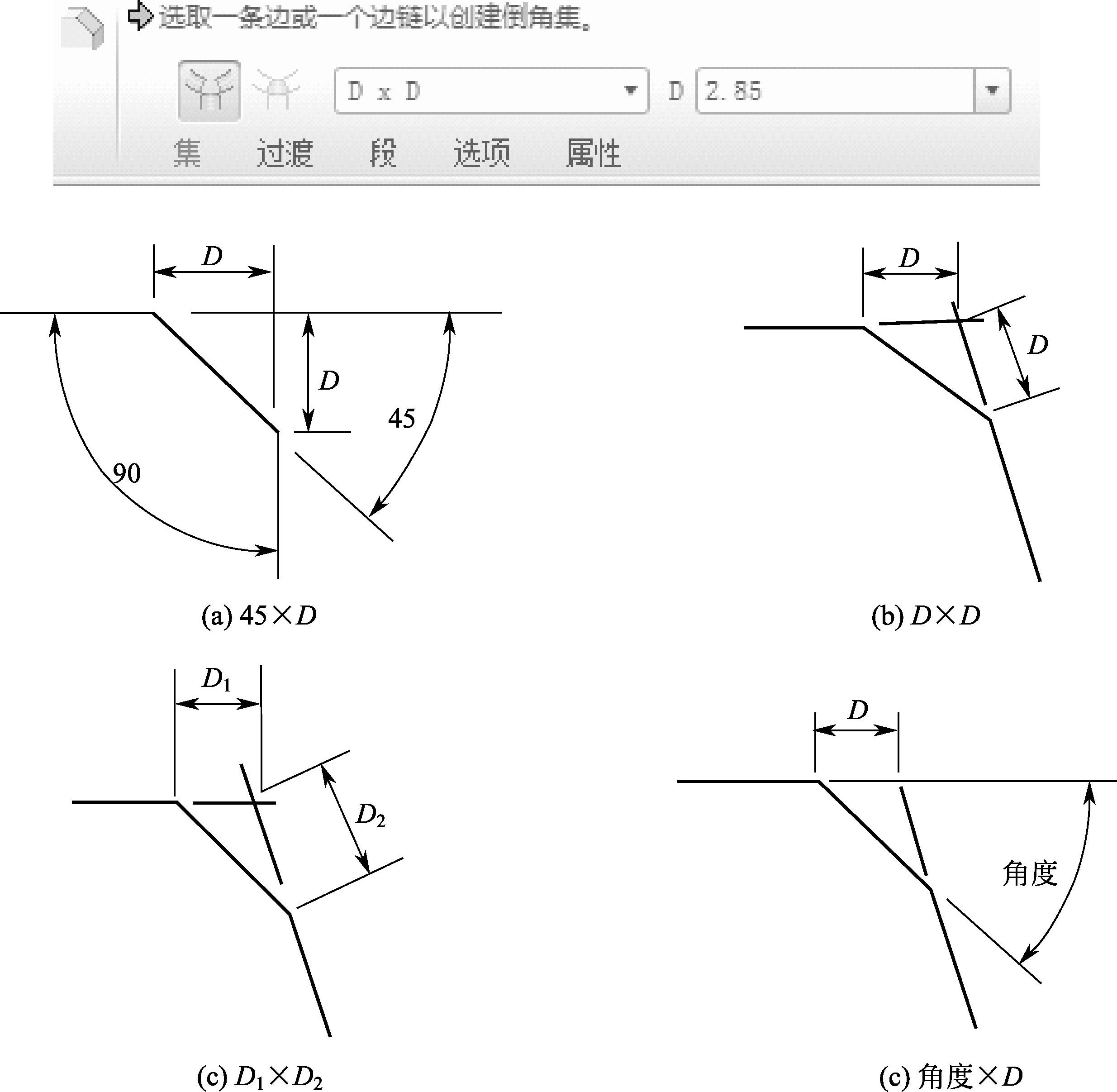 ②倒角形式 设置倒角形式为 D × D 、 D 1 × D 2 、角度× D ,共3种不同的形式。
