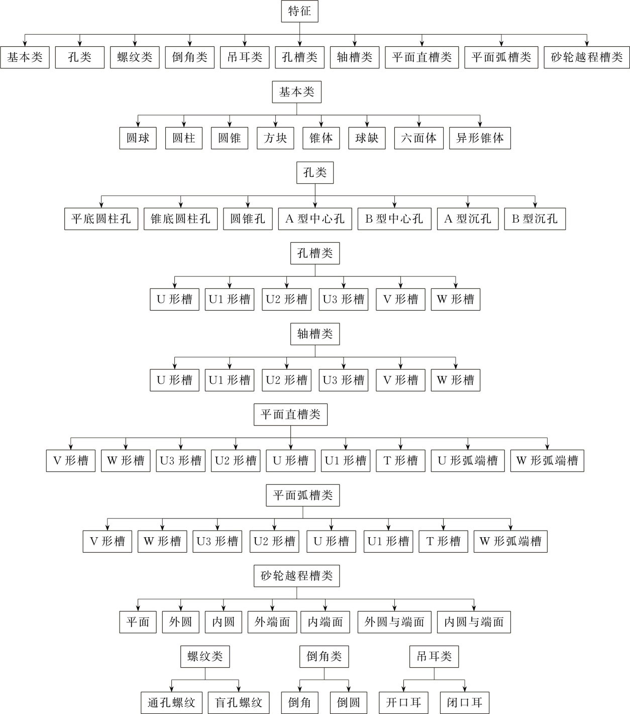 特征的分类与特征的定义有密切关系,不同的特征定义有不同的特征分类方法。图2-19为针对产品设计与加工信息对特征进行分类的结果。