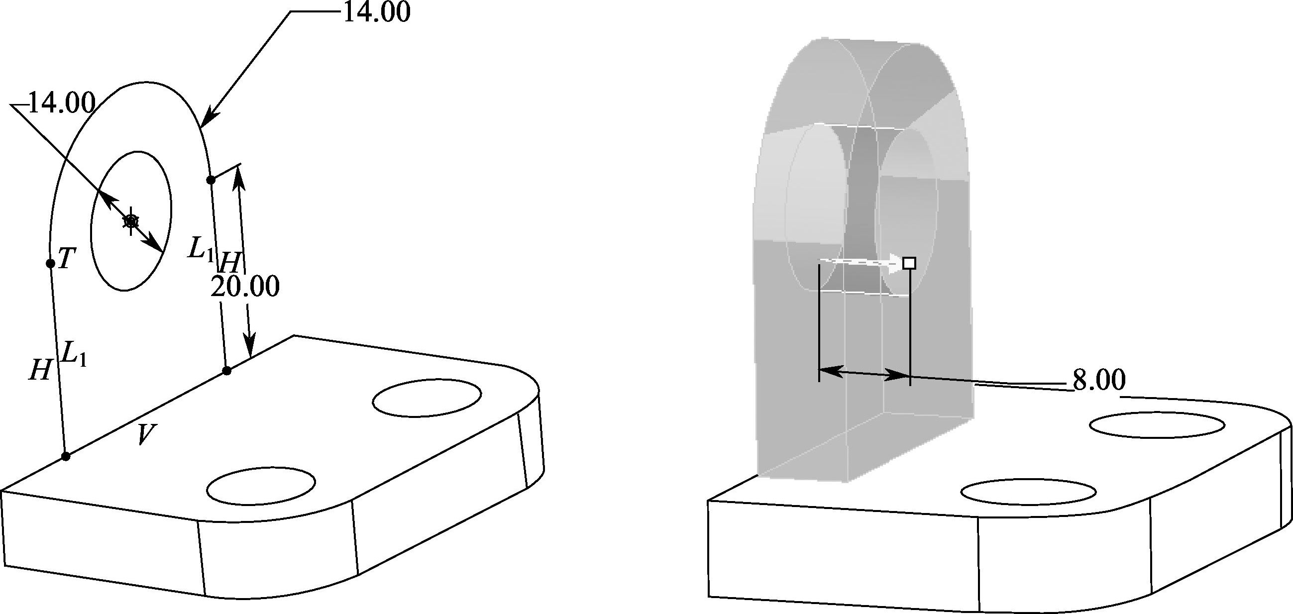 ①几何与尺寸关系。特征之间的几何关系与尺寸关系主要在特征草图中设定,几何关系包括特征草图实体之间的相切、等距等几何关联方式,尺寸关系设定特征草图实体之间的距离和角度关联。