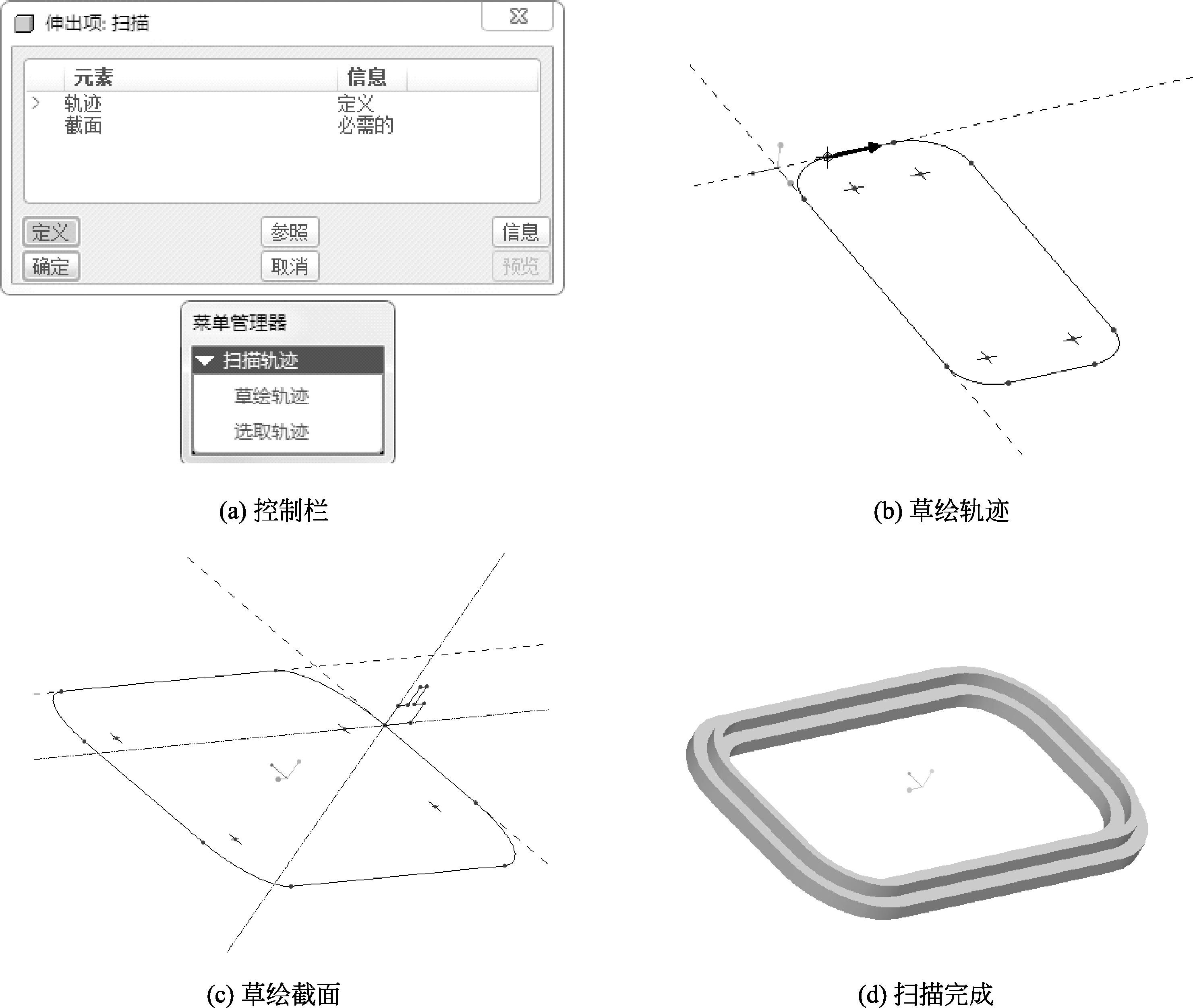从图2-24中可以看出,扫描建模与拉伸建模不同,拉伸建模的截面是沿着截面的法向方向移动拉伸生成实体,扫描建模的截面是沿着定义的轨迹曲线进行移动扫描生成实体,而截面的法向将沿着轨迹曲线的切线方向发生变化。同时拉伸建模的截面恒定不变,而扫描建模的截面可以发生变化。不难发现,拉伸和旋转只是扫描特征的一种特殊形式。