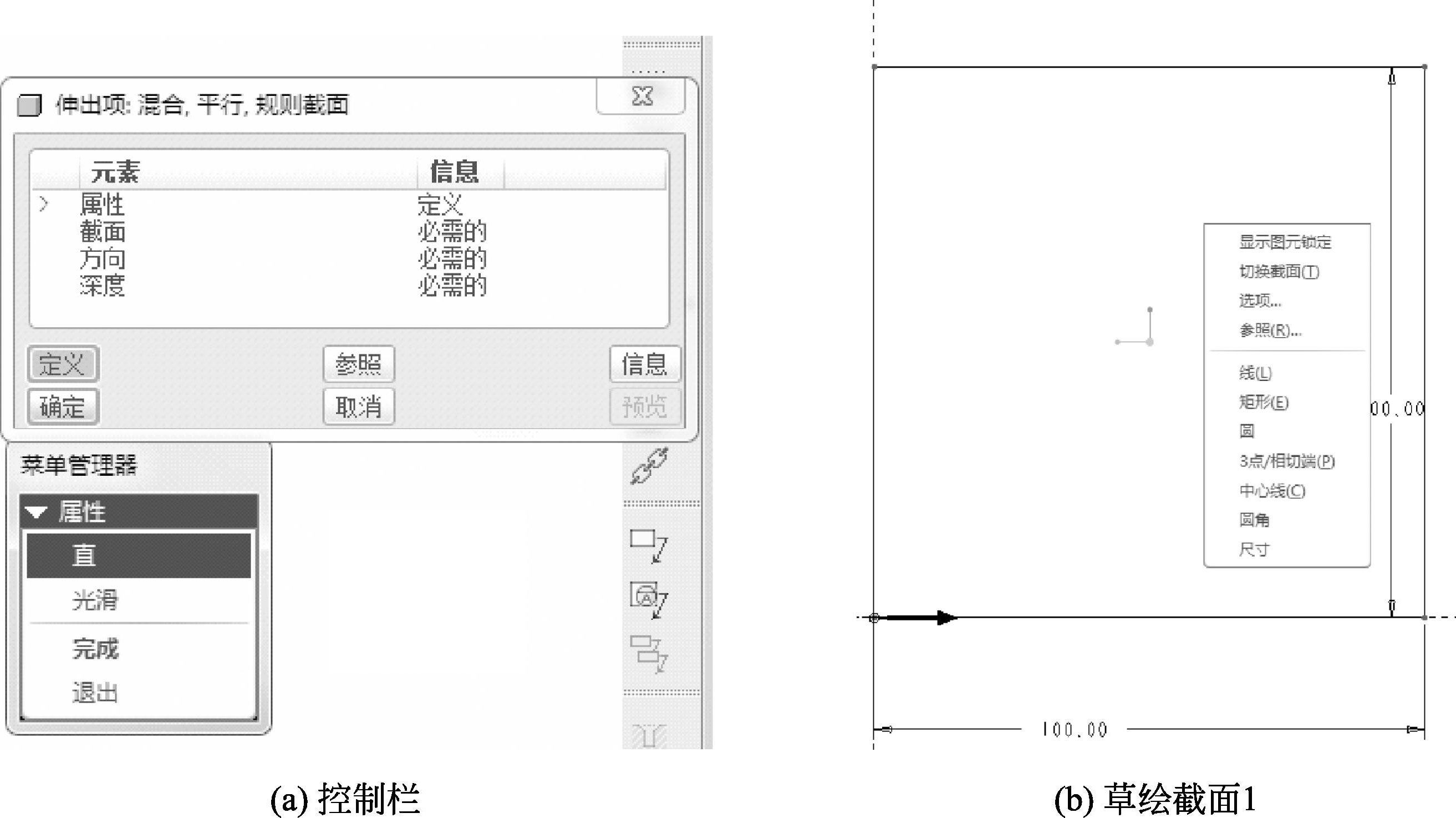 ①恒定截面扫描特征 恒定截面扫描是指在扫描生成实体的过程中截面的大小和形状始终保持恒定不变。恒定截面扫描按照截面和轨迹曲线是否封闭又分为截面封闭轨迹开放扫描、截面开放轨迹封闭扫描和截面轨迹都封闭扫描三种类型。所谓截面开放,是指构成截面的图元不封闭,同理轨迹开放是指轨迹曲线不封闭。