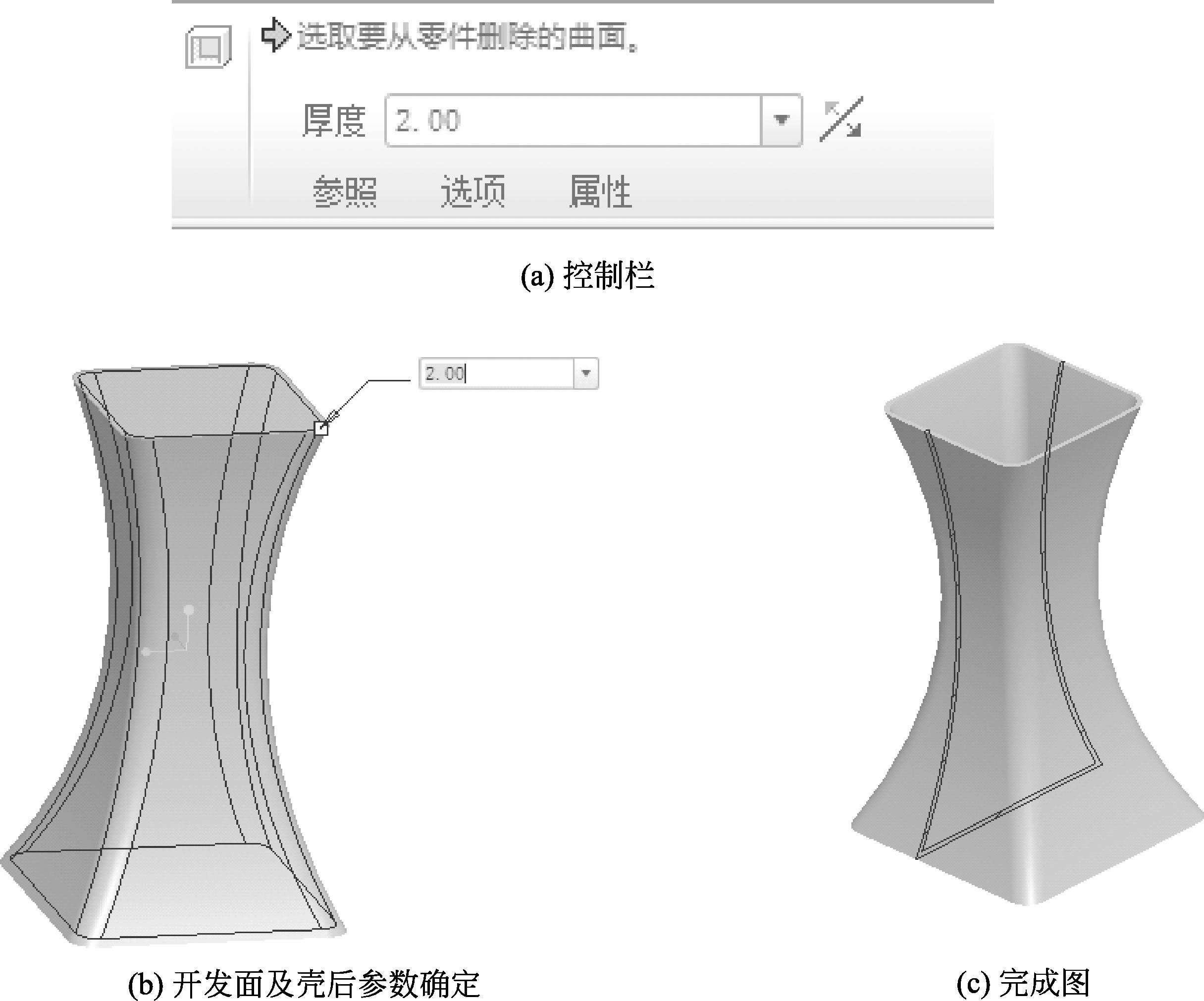 薄壳特征是指在已有实体特征上选择一个或多个移除面,并从移除面开始掏空特征材料,只留下指定壁厚的抽壳,该抽壳称为薄壳特征,见图2-30。