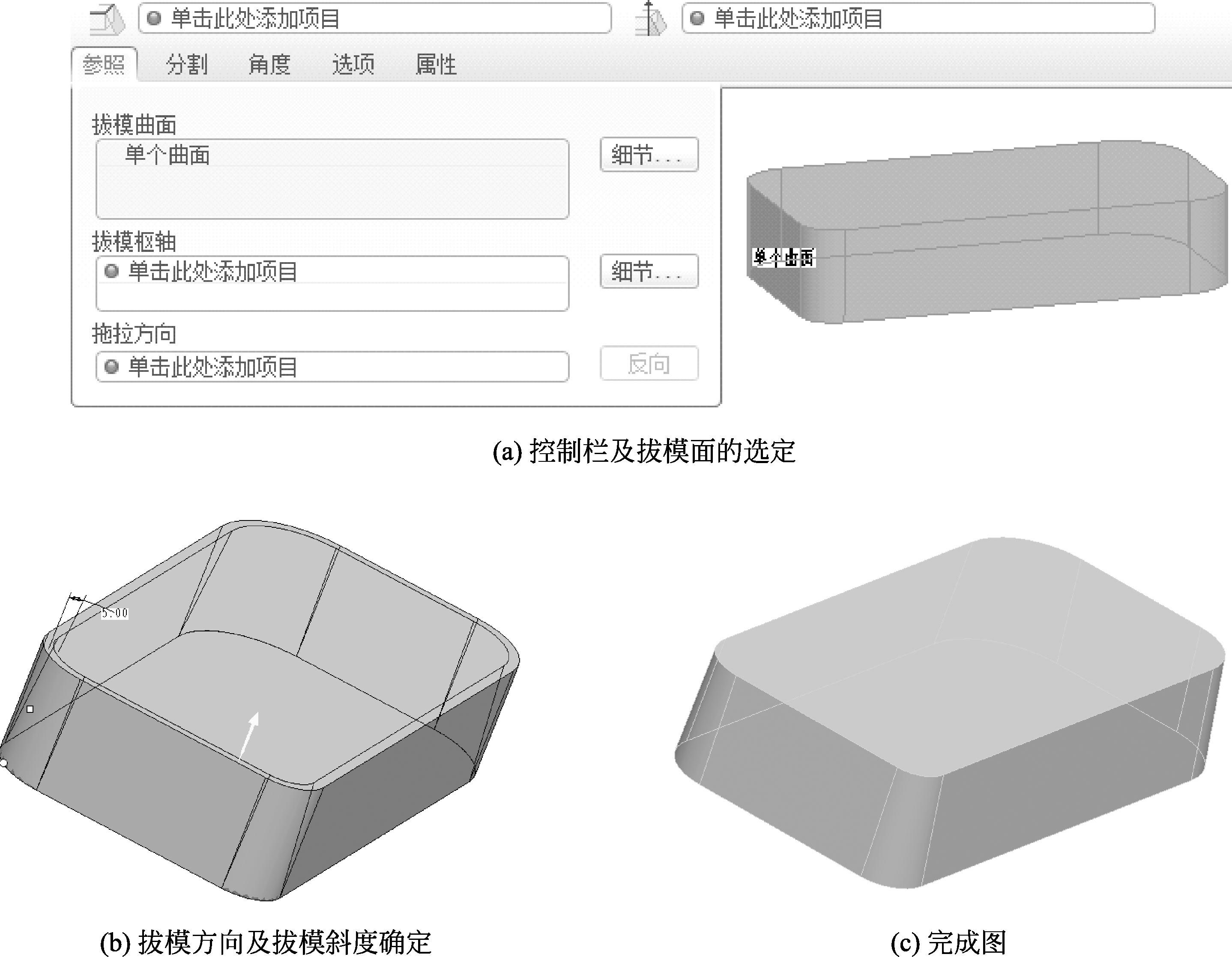 注塑件和铸件往往需要设计有拔模斜面以顺利脱模,在实体特征上创建拔模斜面形成的特征称为拔模特征。生成拔模特征时,可控制的选项和参数如图2-31所示。