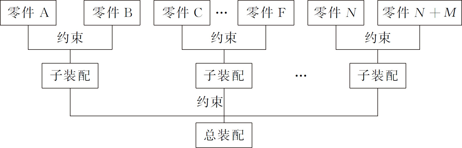 自底向上(bottom-up)的装配建模方法反映了实际生产的装配过程:首先建立零件的三维模型,然后像搭积木一样通过约束组合零件模型形成子装配,再将子装配通过约束组合形成总装配模型,如图2-35所示。