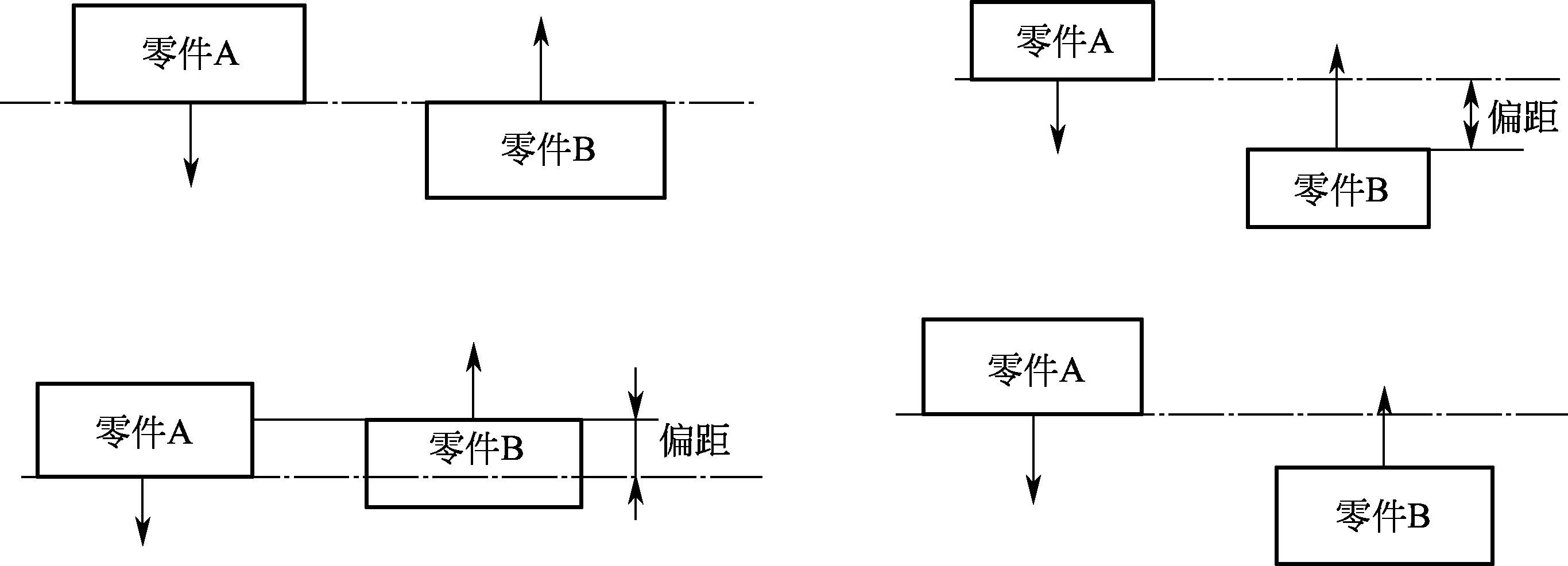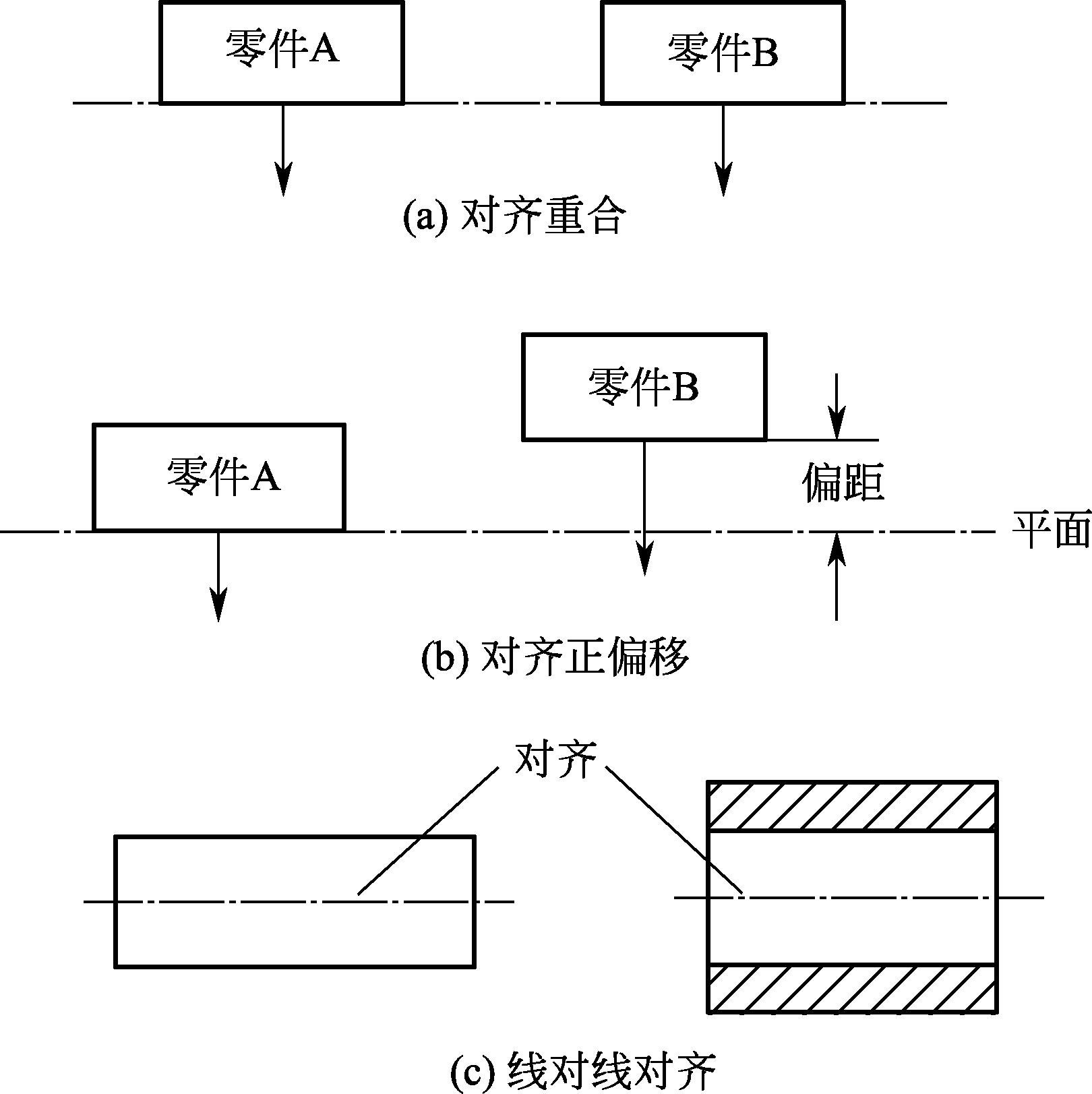 对齐约束使待装配零件与参照对象的正法线方向相同进行定位,其中参照对象可以是模型表面、基准平面、轴线、边、基准点或顶点。对齐约束要求所选的两个对象要统一,即面对面、点对点、线对线。当面对面时,对齐约束有重合、偏移和定向3种情况;当线对线时,两线只能在同一条直线上;当点对点时,两点只能重合,如图2-39所示。