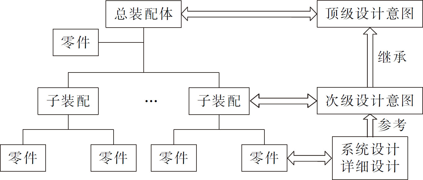 自顶向下(top-down)装配建模方法与自底向上方法相反,它是从整体外观(或总装配)开始,然后到子装配,再到零件的建模方式。如图2-36所示,在装配关系的最上端是顶级设计意图;接下来是次级设计意图(子装配),继承于顶级设计意图;然后每一级装配分别参考各自的设计意图,展开系统设计和详细设计。