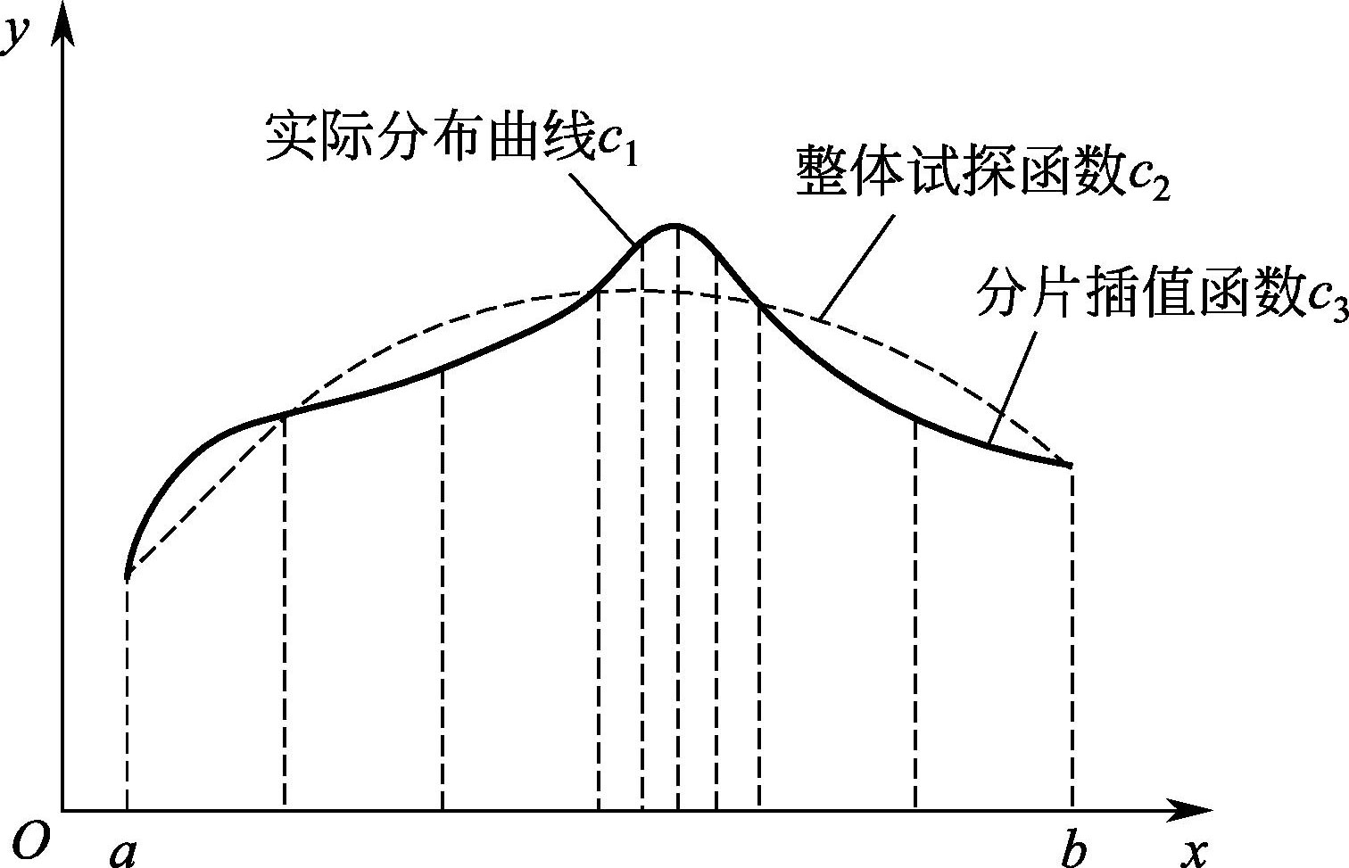 分片插值的概念可以借助图3-3加以说明。假设真实函数为曲线 c 1 ,求解域为[ a , b ]。理论上讲,只要定义在[ a , b ]上的试探函数(亦称插值函数) c 2 具有足够高的阶次就能逼近真实函数 c 1 ,但实际上 c 2 对 c 1 局部特征的逼近并不理想。如果将求解域划分成若干长度不等的小区间,则可在每一个小区间内用较低阶(例如一阶或二阶)的试探函数 c 3 来逼近 c 1 ,并且通过适当调整求解域局部小区间的数量或尺寸来提高逼近精度,从而获得真实函数 c 1 的近似解。