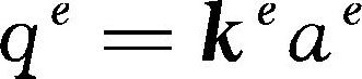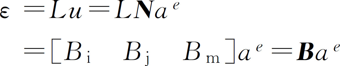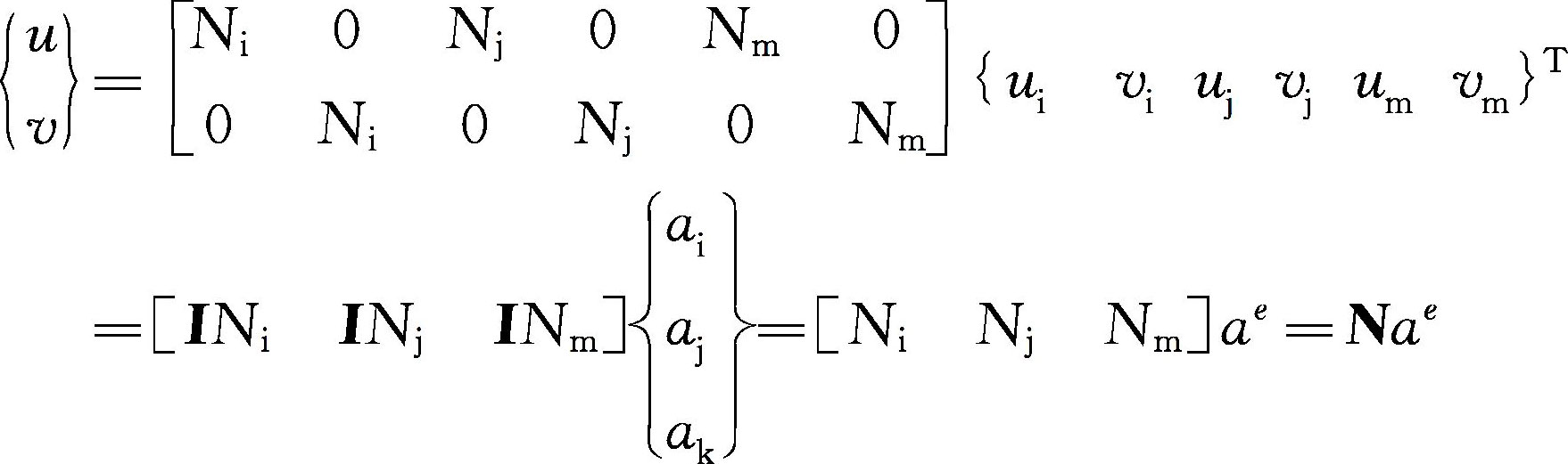 ①单元位移与单元形函数 一个三节点三角形单元共有12个自由度(6个节点位移分量和6个节点转动分量),在线弹性范围内,6个节点转动分量可以忽略不计,由此可给出单元位移 a e 的向量表达式如下: