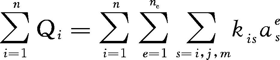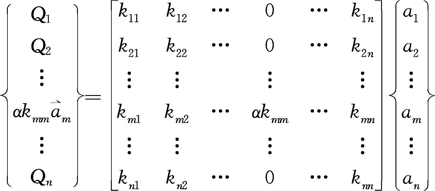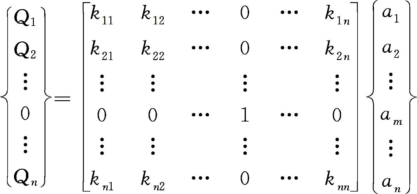 观察式(3-28)可以发现:总刚度矩阵中与零位移节点 a m 对应的主对角元素 k nn 为1,其余相关元素(即下角标中含有 n 的 k 元素)均为0;载荷列阵中与零位移结点对应的元素 Q n 为0。