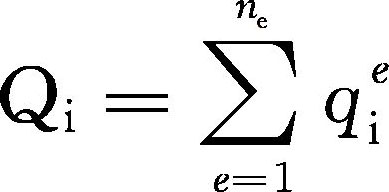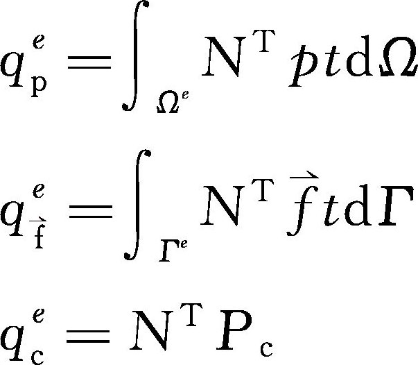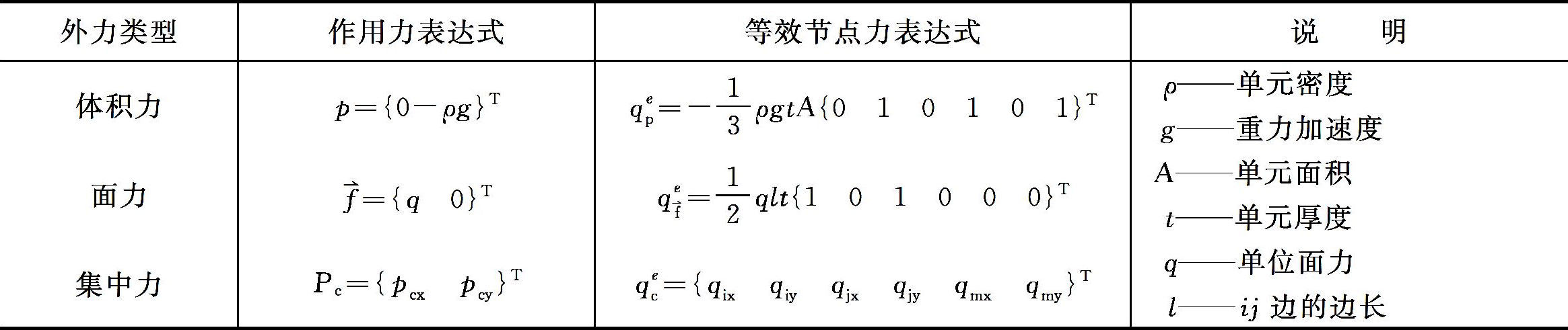 ③设置载荷边界条件 设置载荷边界条件实际上是为总载荷列阵中的各分量元素赋初值。结合位移边界条件设置可以简化赋值过程,即只针对未经式(3-28)和式(3-29)处理的载荷元素赋值。需要注意的是:除零位移和已知位移节点外,载荷中的等效体积力应平均加载到所有剩余节点上,等效面力应加载到面力边界节点上,而等效集中力则应根据情况加载到相应单元的节点上。这样处理后的总载荷列阵中,有的载荷分量可能为零(对应零位移节点),有的载荷分量可能是2~3种等效节点力的叠加(例如,某边界节点既受等效面力作用,又受等效体积力作用)。