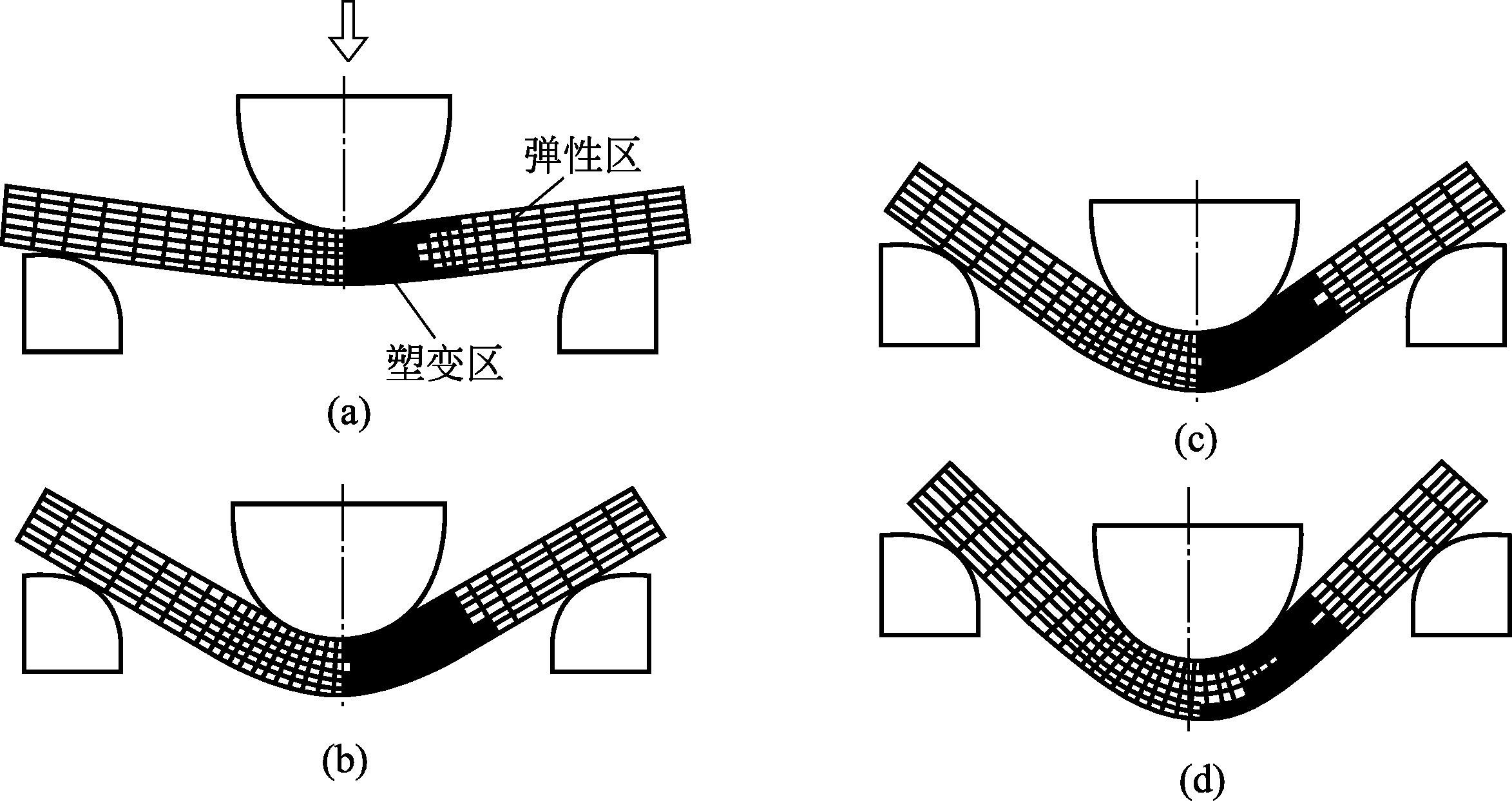 ②几何非线性 几何非线性是指由物体内质点的大位移和大转动引起的非线性,力学上表现为研究对象的几何方程不满足线性关系。例如图3-12所示的材料弯曲,塑变区的材料质点不仅存在大位移,而且还存在某种程度的转动。
