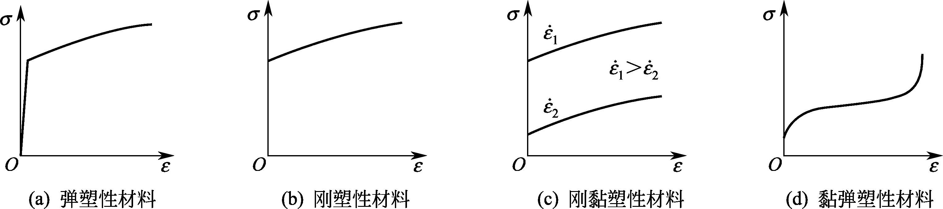 比较图3-11中的各曲线特征可知,当前三类材料的变形进入塑性区后,均存在某种程度的应变硬化现象,即随着材料塑性变形量的增加,维持其变形所需的应力(流动应力)也增加,并且两者之间的关系是非线性的;刚(黏)塑性材料与弹塑性材料的区别在于前者的弹性变形相对于其塑性变形可以忽略不计,即假设材料屈服前为刚性;刚塑性材料与刚黏塑性材料的区别在于后者的应力应变关系还与应变速率有关;最后一类黏弹塑性材料的应力应变关系属于高度非线性,其典型代表为(中等结晶的)热塑性塑料。