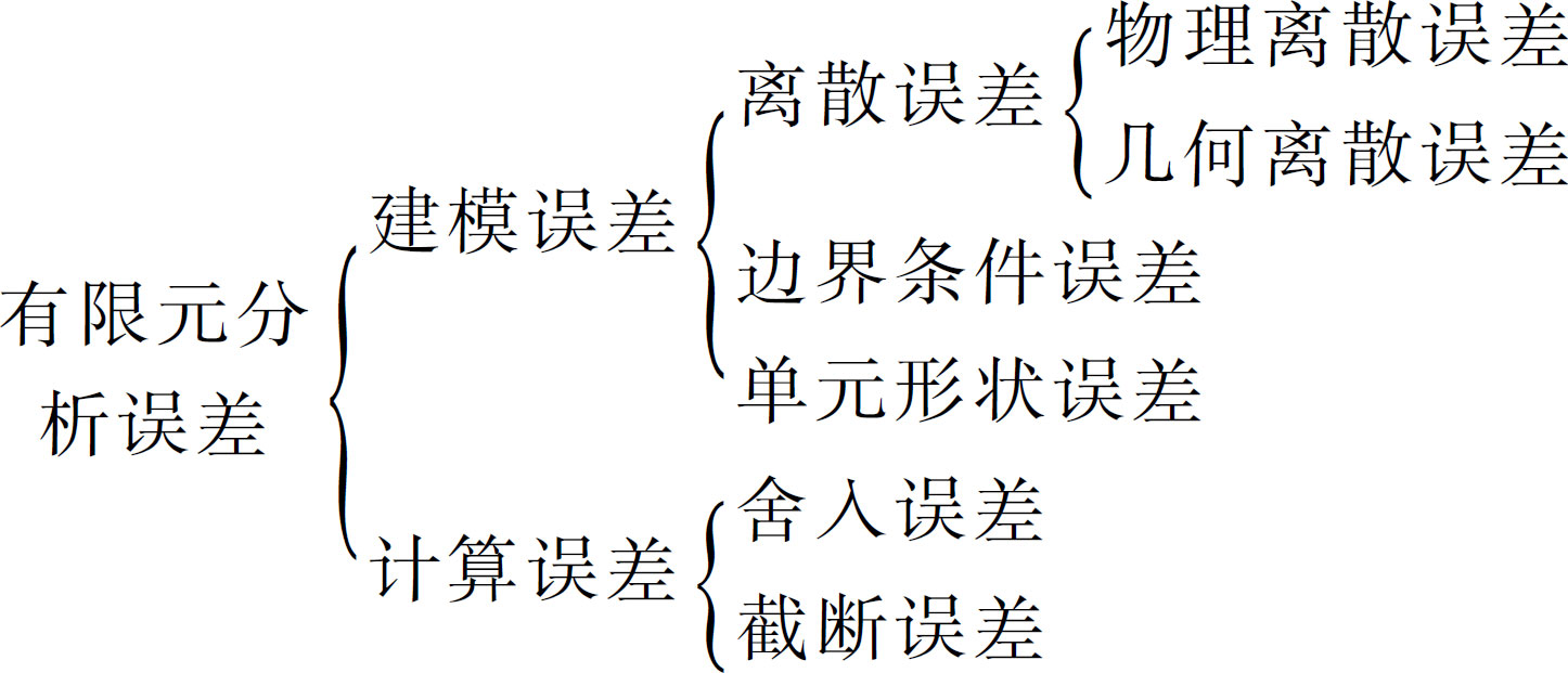 有限元解的误差主要来源于有限元建模误差和数值计算误差,其中,有限元建模误差包括求解对象(域)离散误差、边界条件误差和单元形状误差。图3-6是有限元解(或有限元分析)的误差组成。