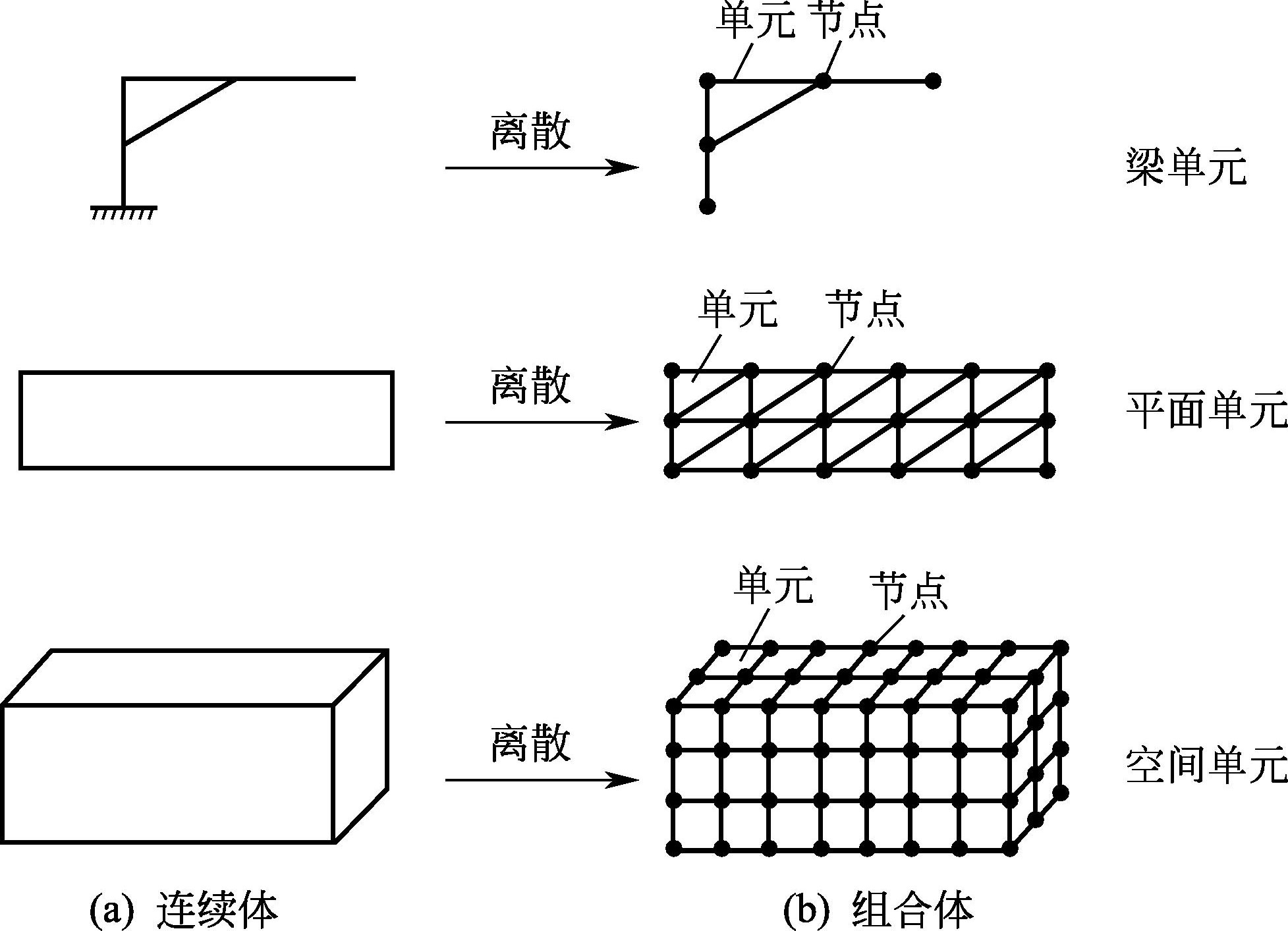 图3-2是对离散概念的图解说明。离散求解域的目的是为了将原来具有无限自由度的连续变量微分方程和边界条件转换成只含有限个节点变量的代数方程组,以方便计算机处理。