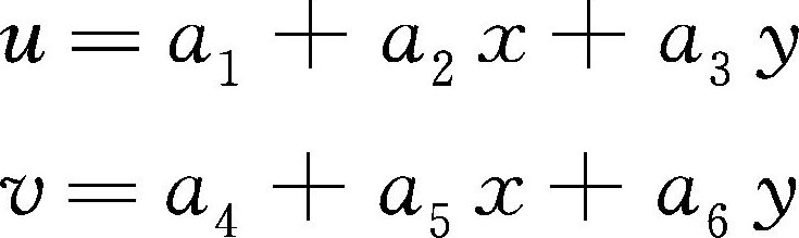求解离散后的平面刚度问题存在两种情况:①位移分量是节点坐标的已知函数,此时,可直接利用单元节点位移分量求出单元应变分量(几何方程),再由单元应变分量求出单元应力分量(本构方程),最后综合起来便可得到整个平面刚度问题的解;②只有几个结点的位移分量已知,不能直接求出应变和应力分量。对于后者,为了利用结点位移表示单元应变和应力,必须构造一个位移模式(位移函数)。理论上,定义于某一闭区域内的任意函数总可以被一个多项式逼近,所以,位移函数常常取为多项式。现选用一次多项式作为三节点三角形单元的位移模式(位移插值函数),于是有: