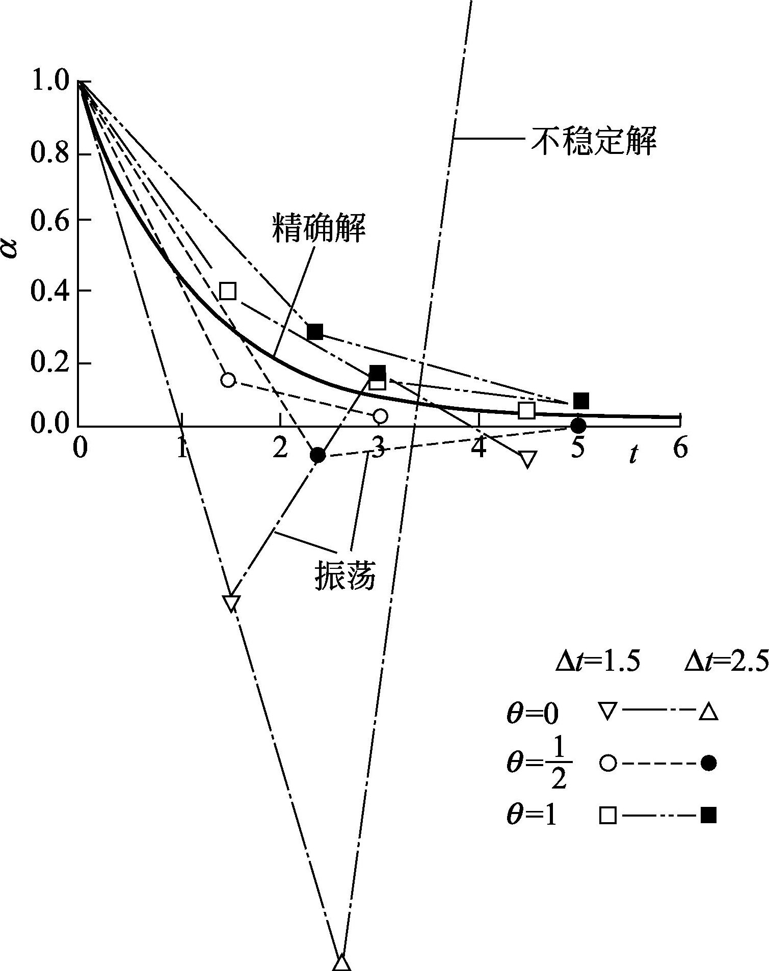当利用增量-迭代混合法求解方程组(3-32)时,增量步长的选取对有限元解的稳定性影响极大。所谓有限元解的稳定性,是指当载荷步或时间步的长度(步长)取不同值时,方程组(3-32)的收敛误差是否趋于恒定或波动最小。如果增量步长取任意值,误差都不会无限增长,则称有限元解为无条件稳定;如果增量步长只有在满足一定条件时,误差才不会无限增长,则称有限元解为条件稳定。图3-14表示计算某瞬态传热过程,当时间步长Δ t 分别取1.5和2.6时所对应的有限元解收敛误差变化轨迹。其中,横坐标表示迭代次数,纵坐标表示迭代计算的收敛误差。增量步长的选取受多种因素影响,具体方法请参阅后续章节的相关内容。