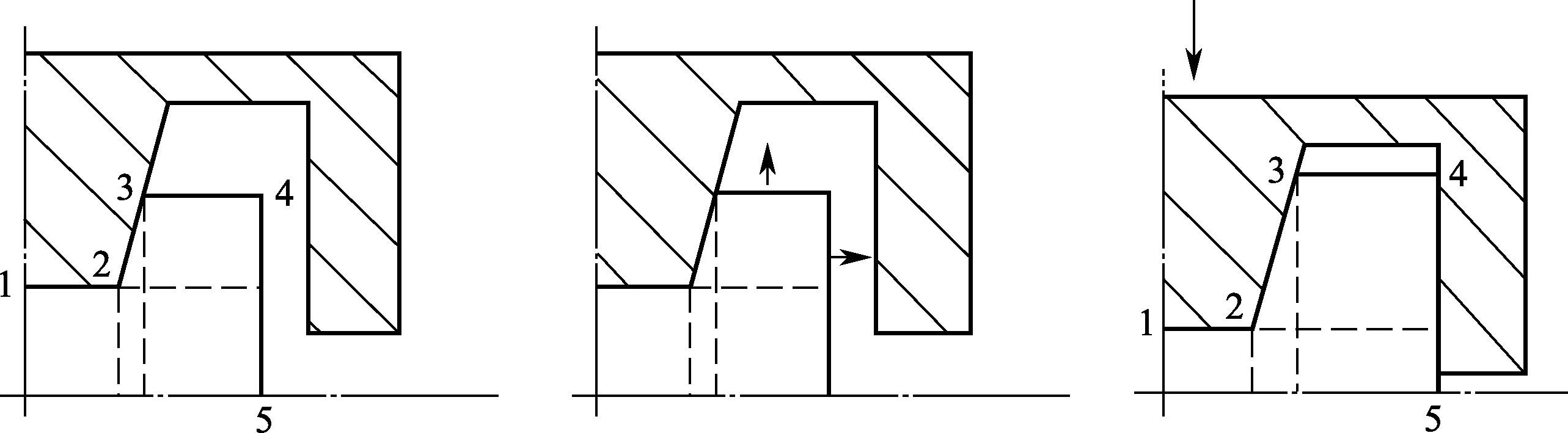 ③边界非线性 边界非线性是指边界条件呈现非线性变化。例如:模锻时,毛坯与模膛表面的接触和摩擦(图3-13),即使不考虑软硬质点的黏着问题,其接触点3也不会沿模膛表面呈线性滑动。