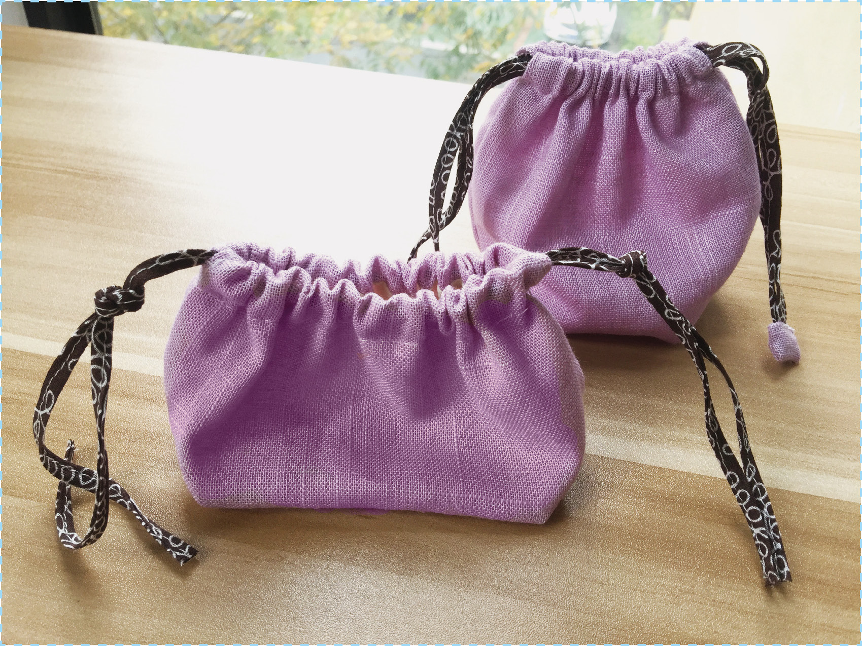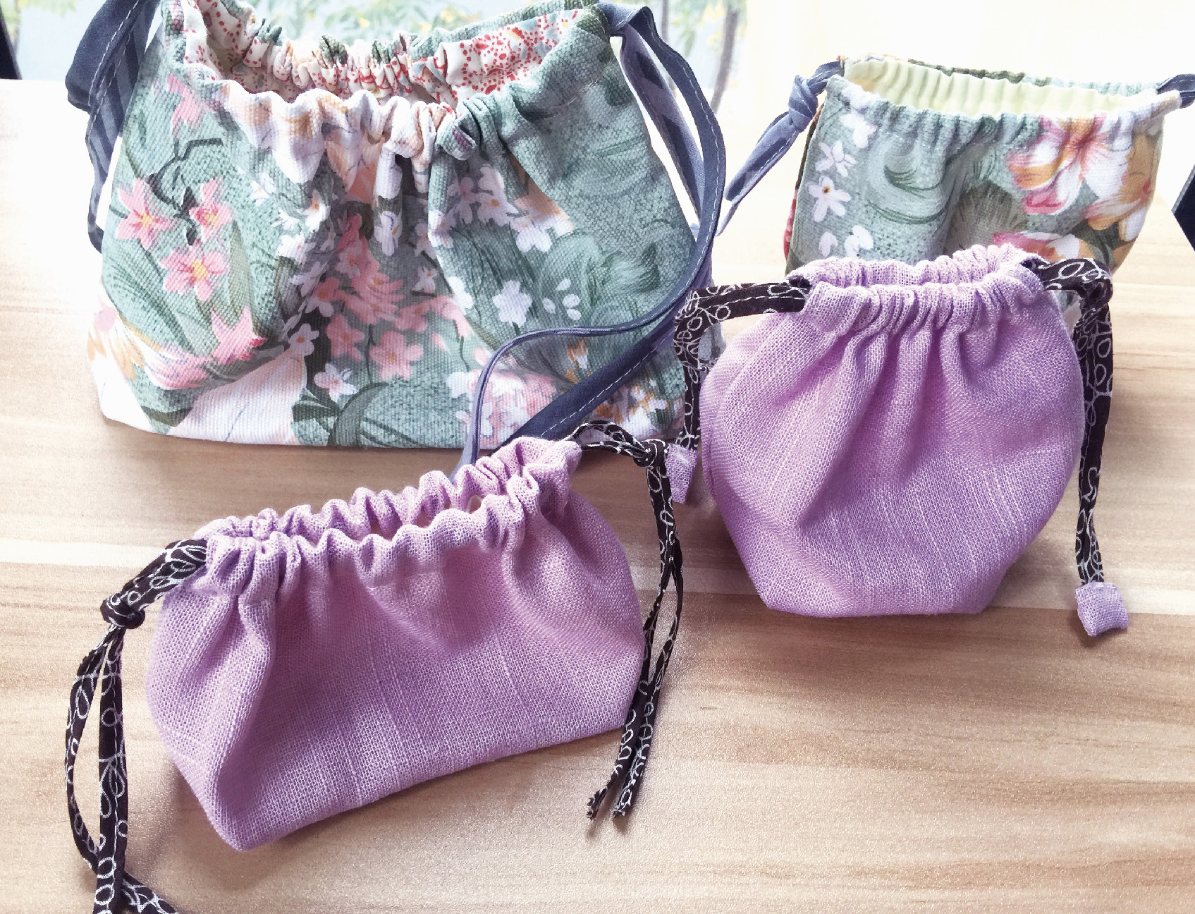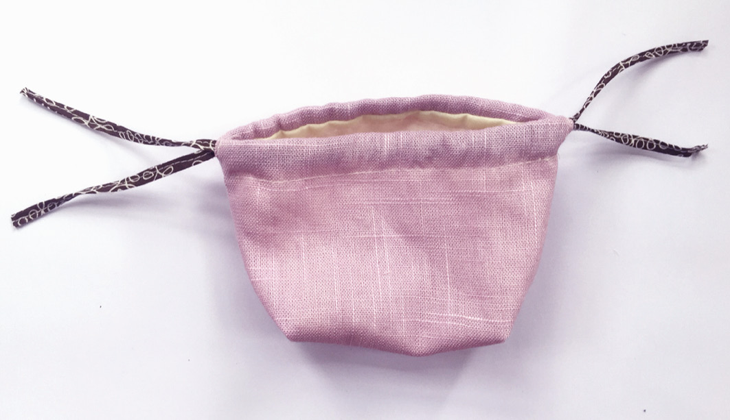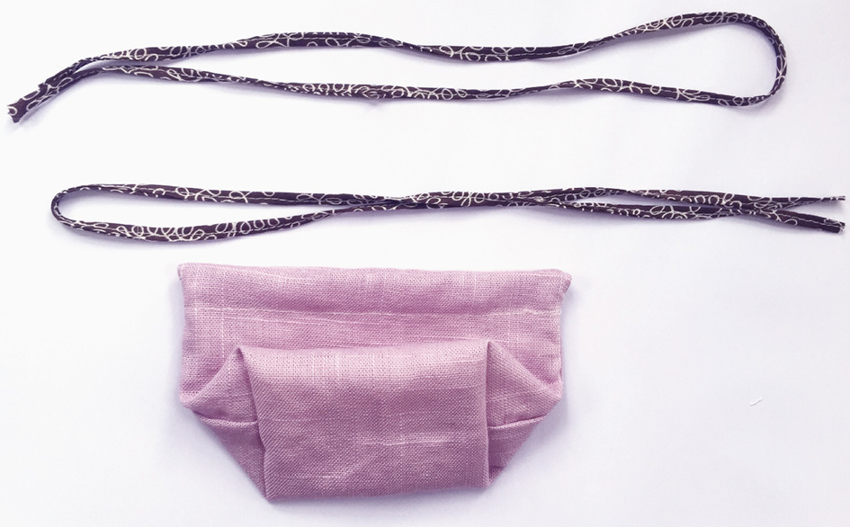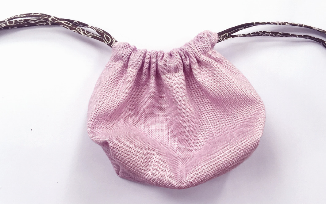 (10)将袋口绳带末端打结或剪小布块封住。可根据自己的需求,改变面料的规格制作自己喜欢的收纳包。如图2-25所示。