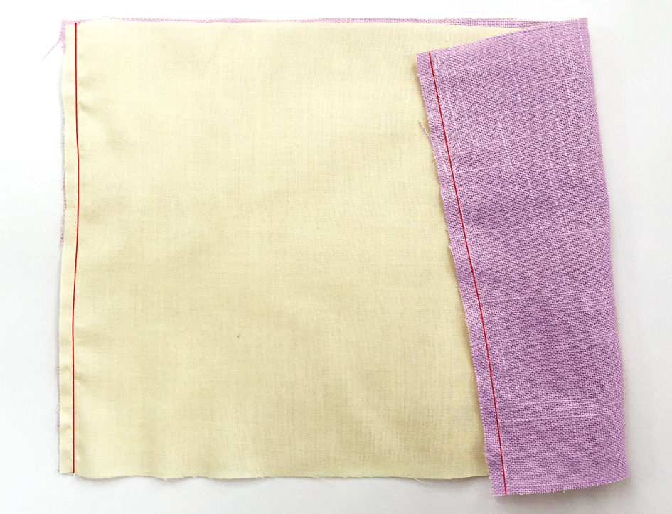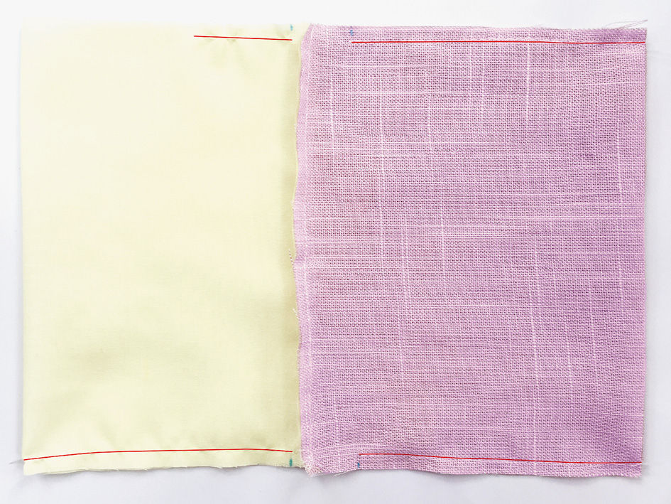 (3)将里布和面布长度相等的宽度部分两端正面与正面对齐,缝合固定在一起。如图2-15所示。