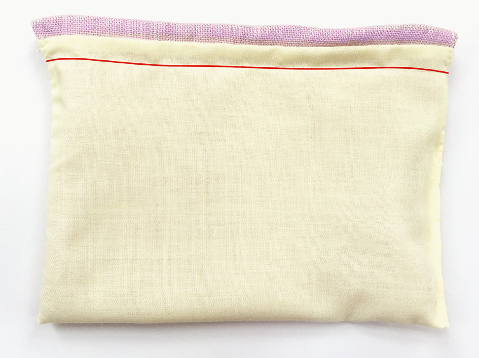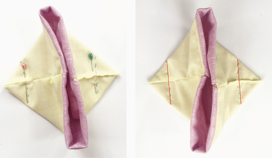 (7)用珠针固定好底部两个角,大小随自己所需,左右对称就行。可以用记号笔做缝合固定位置的辅助线,然后将两个角缝合固定。如图2-20所示。