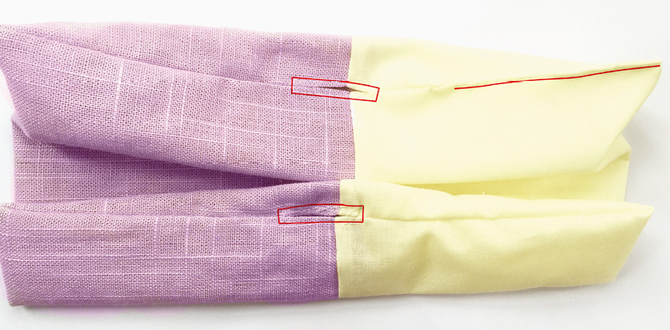 (5)沿翻折口翻折后,缝合好翻折口,并缝合固定穿绳口。如图2-17、图2-18所示。