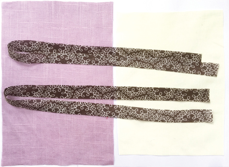 (1)首先剪裁面料、里料,面料的规格为28cm×18cm,里料的规格为25cm×18cm。印花布条宽度为2cm,剪两条,长度尽量长一些,至少超过袋口三倍以上。如图2-13所示。