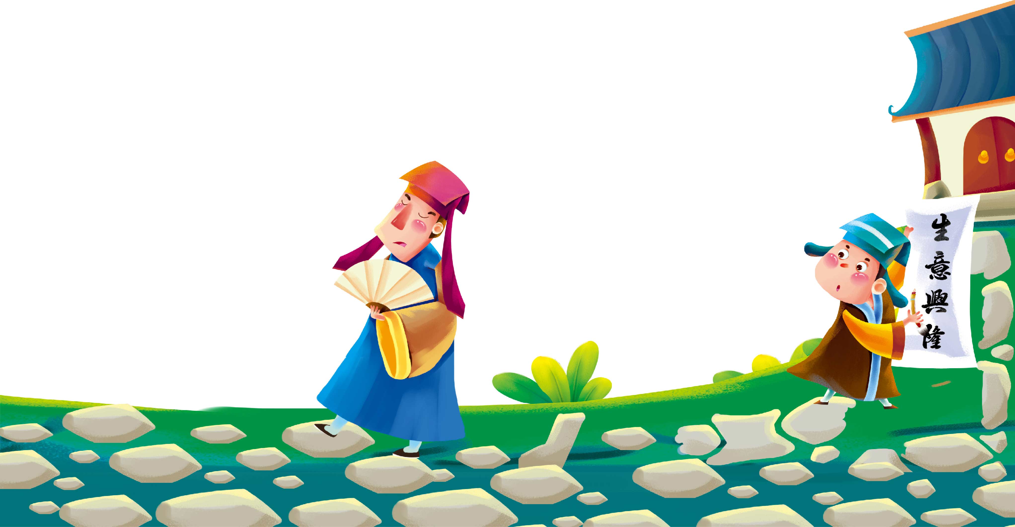 这时,一个拿着折扇的书生从旁边经过,他瞅了两眼字,不屑地说:“‘生’字下笔太重,死气沉沉;‘意’字墨守成规,灵气全无;‘兴’字笔力不足,毫无骨力;‘隆’字自以为飘逸传神,其实是浮夸造作。真是失败!”说完,他摇着折扇扬长而去。
