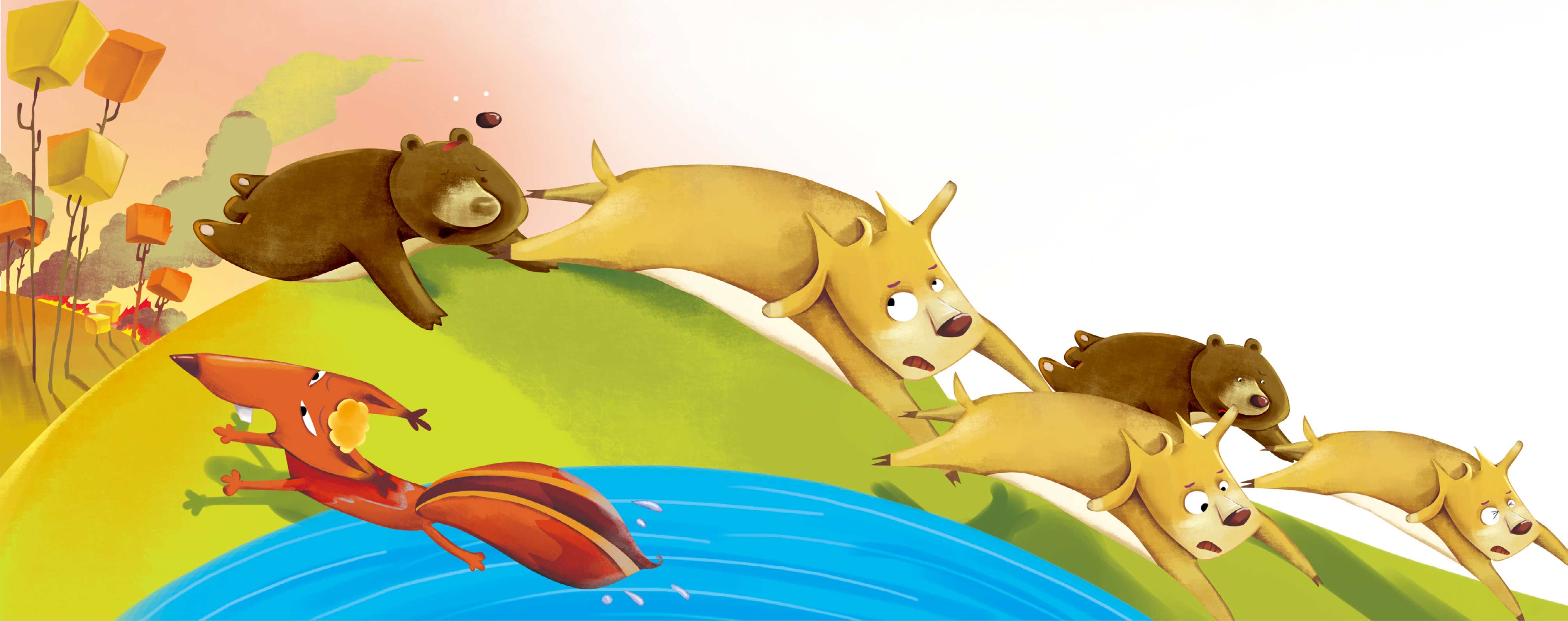 这时,只见一只小松鼠在一个即将被烈火烤干的水塘中,将自己瘦小的身子完全沾湿,然后再冲进火场,拼命抖洒着身上沾的水珠,希望用这个方法缓解火势。